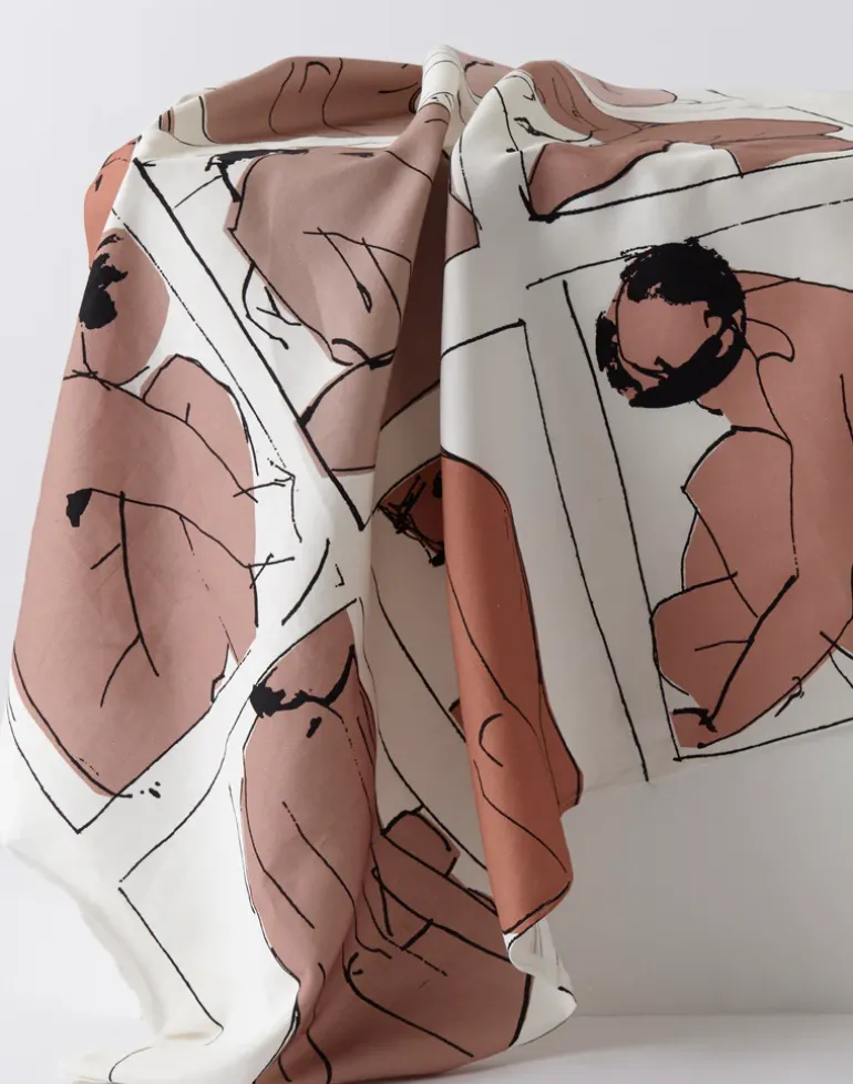 Printed with reactive dyes onto a heavyweight linen in a variety of terracotta reds, ochres and pinks. Perfect for curtaining, soft furnishing or domestic upholstery.