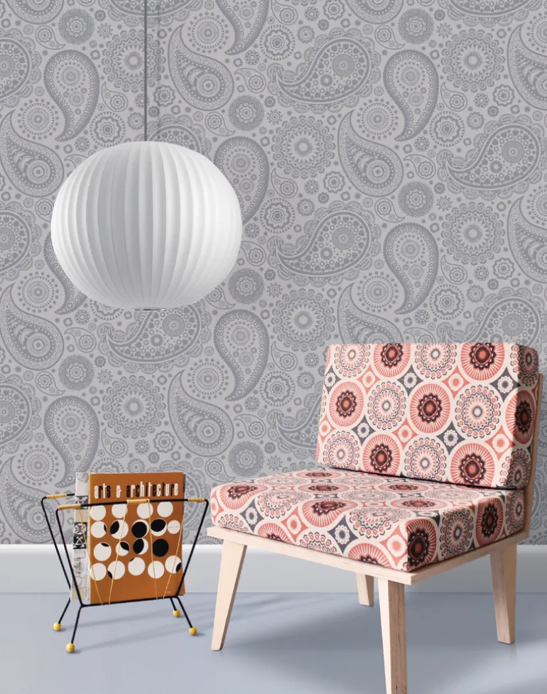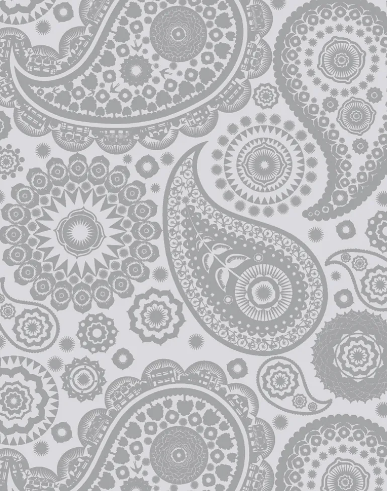 This print fuses the ornamentation of a traditional Indian-inspired paisley design with the ordered iconography of life in the commuter belt. It was a highlight of our ‘Buddha of Suburbia’ collection.