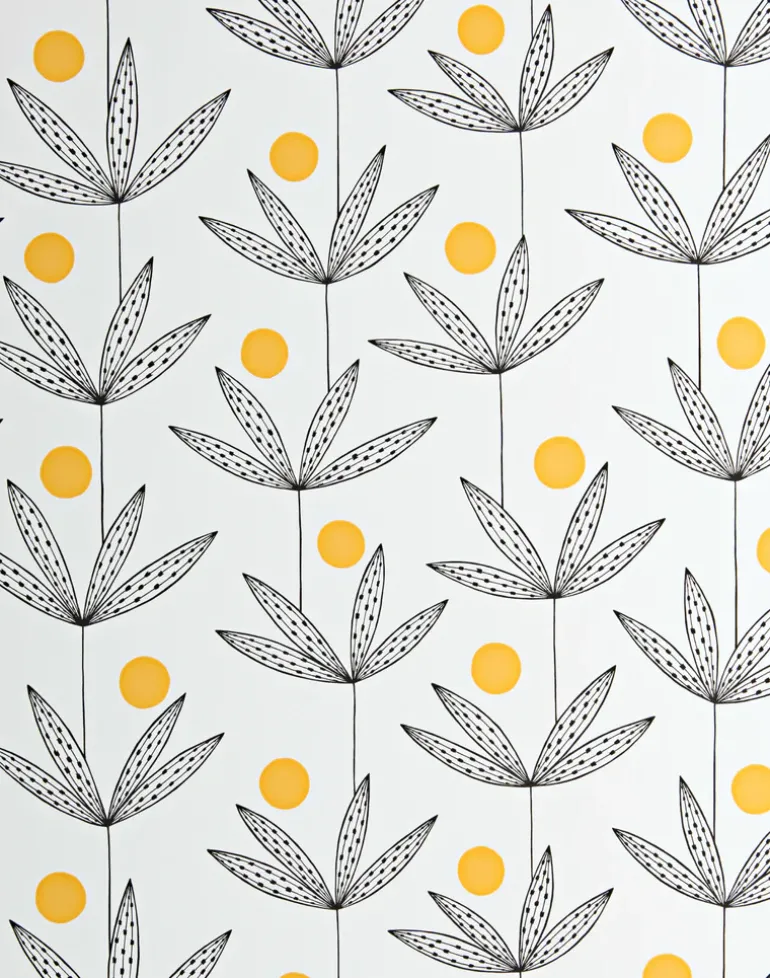 A delicate, line art version of palm trees growing vertically, with hand drawn stems and foliage. Between the leaves a bold circular pop of differing color helps harmonize the repeating pattern across the wall. All of our prints were originally drawn by hand and developed in our own studio.