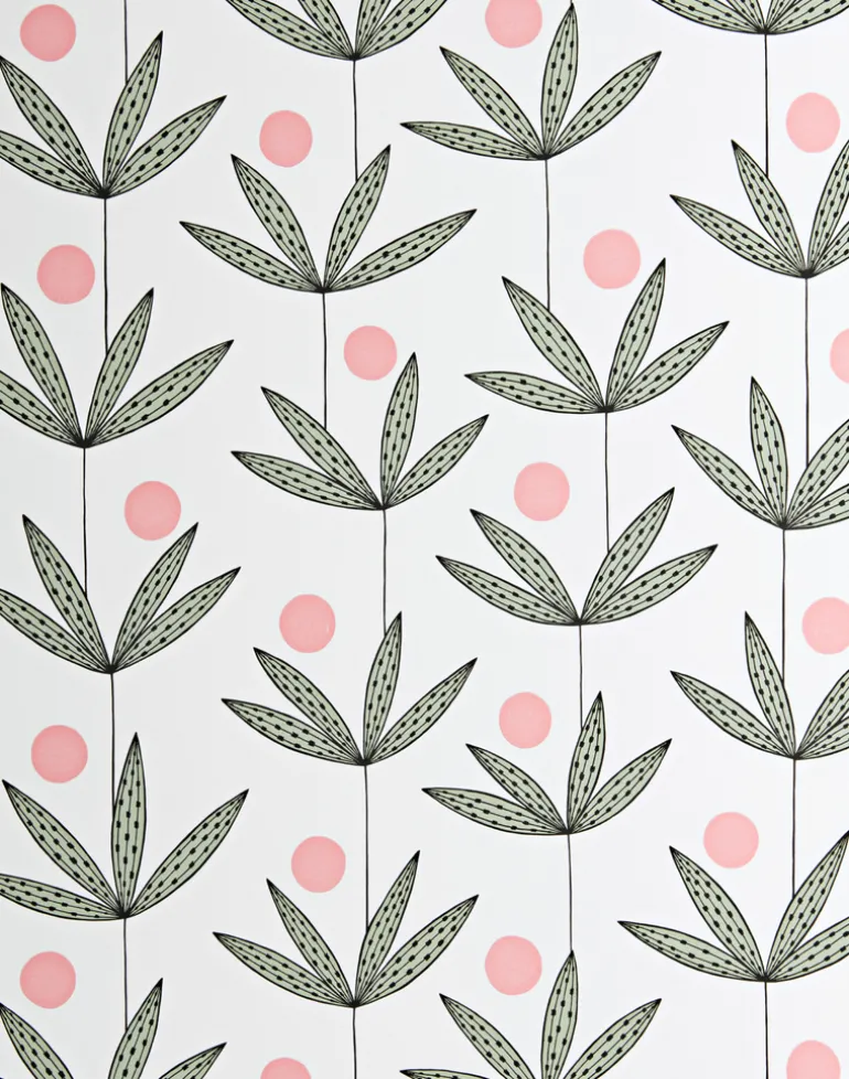 A delicate, line art version of palm trees growing vertically, with hand drawn stems and foliage. Between the leaves a bold circular pop of differing color helps harmonize the repeating pattern across the wall. All of our prints were originally drawn by hand and developed in our own studio.