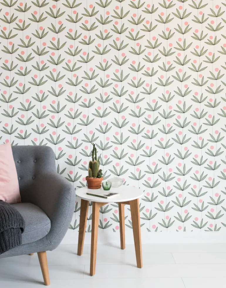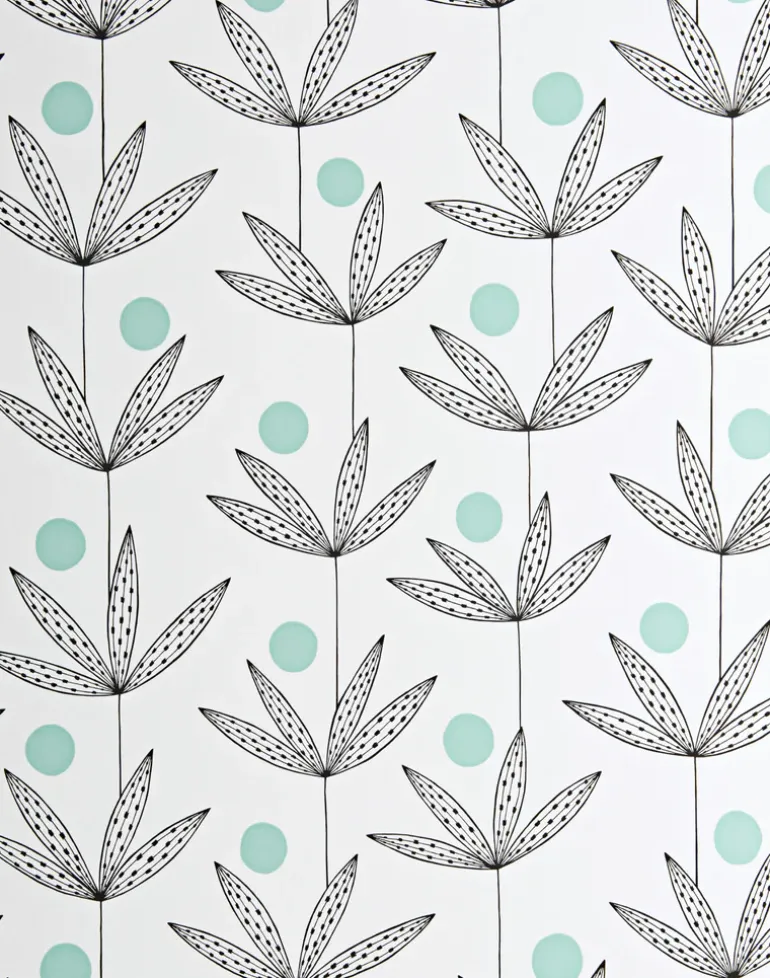 A delicate, line art version of palm trees growing vertically, with hand drawn stems and foliage. Between the leaves a bold circular pop of differing color helps harmonize the repeating pattern across the wall. All of our prints were originally drawn by hand and developed in our own studio.