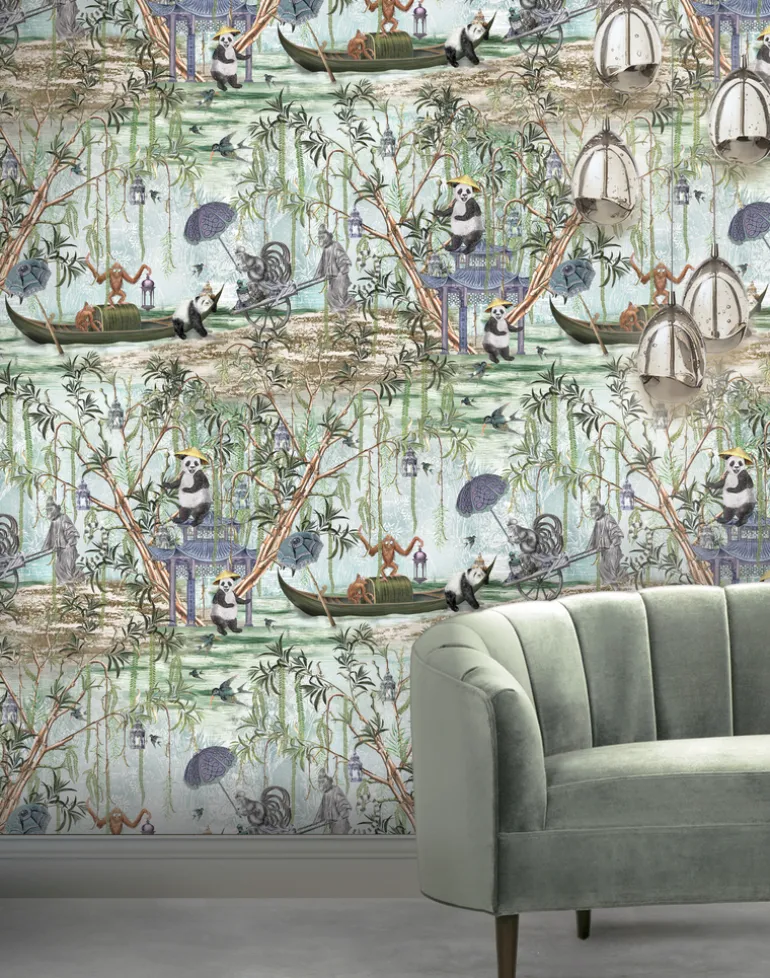 Inspired by traditional Toile de Jouy designs, this wallpaper brings a touch of 18th century class to the modern day. The customary quaint design has been revamped Santorus-style with exotic animals dancing the night away. All the merriment is too much for some; spot the dozing panda who has been put to bed after having one too many at this epic jungle party. The subtle colors mixed with the daring design make this wallpaper the perfect day-to-night feature piece in any room.
