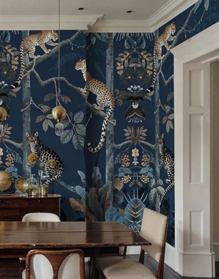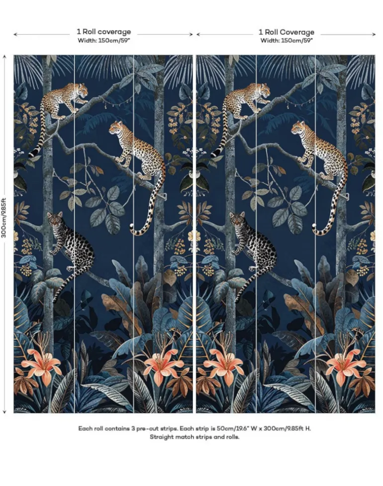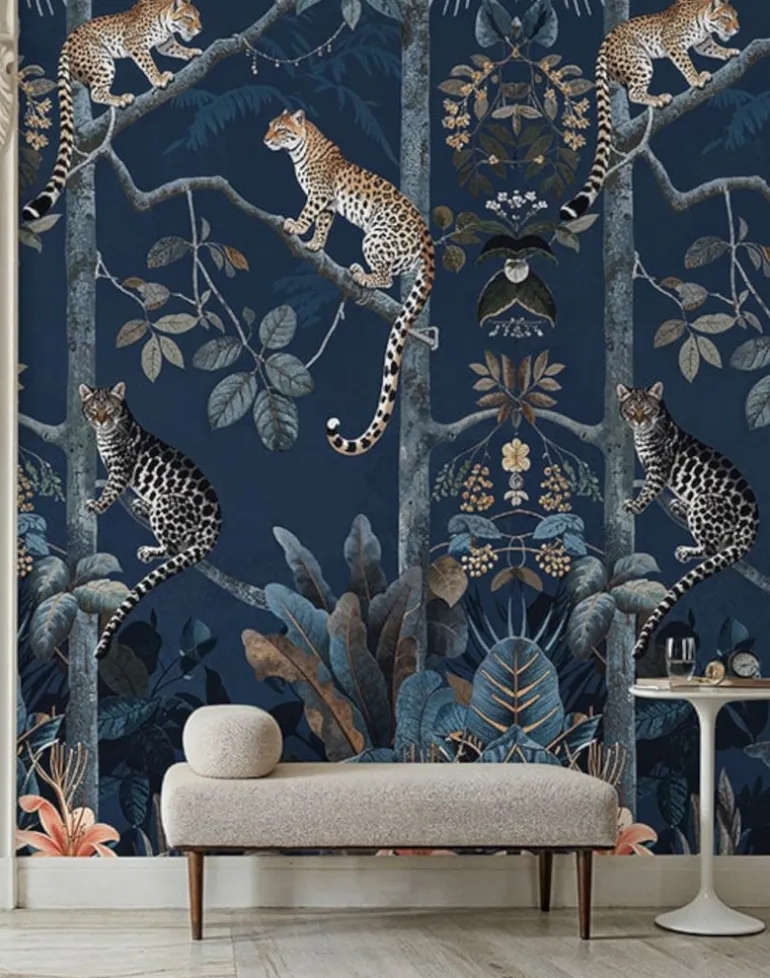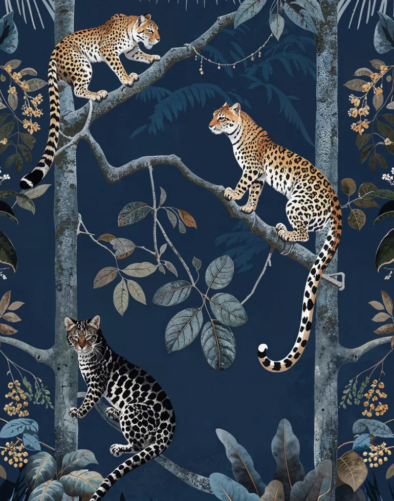 Step into the enchanting world of “Panthera Blue,” a blue leopard wallpaper where luxury meets the jungle. Exemplifying the finest tropical wallpaper, its cream-hued backdrop is a canvas for sapphire-toned foliage and the graceful poise of leopards. The illustration detail is exquisite, creating a seamless high-quality pattern that captivates and delights. The “Panthera Blue” blue leopard wallpaper harmonizes beautifully with a myriad of design aesthetics, from the tranquil and serene to the bold and dramatic. Ideal for infusing any space with a breath of sophistication, our blue jungle leopard wallpaper invites a timeless elegance into modern, classic, or eclectic interior design schemes, making it the perfect backdrop for those seeking to make a sophisticated statement.