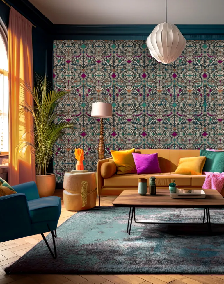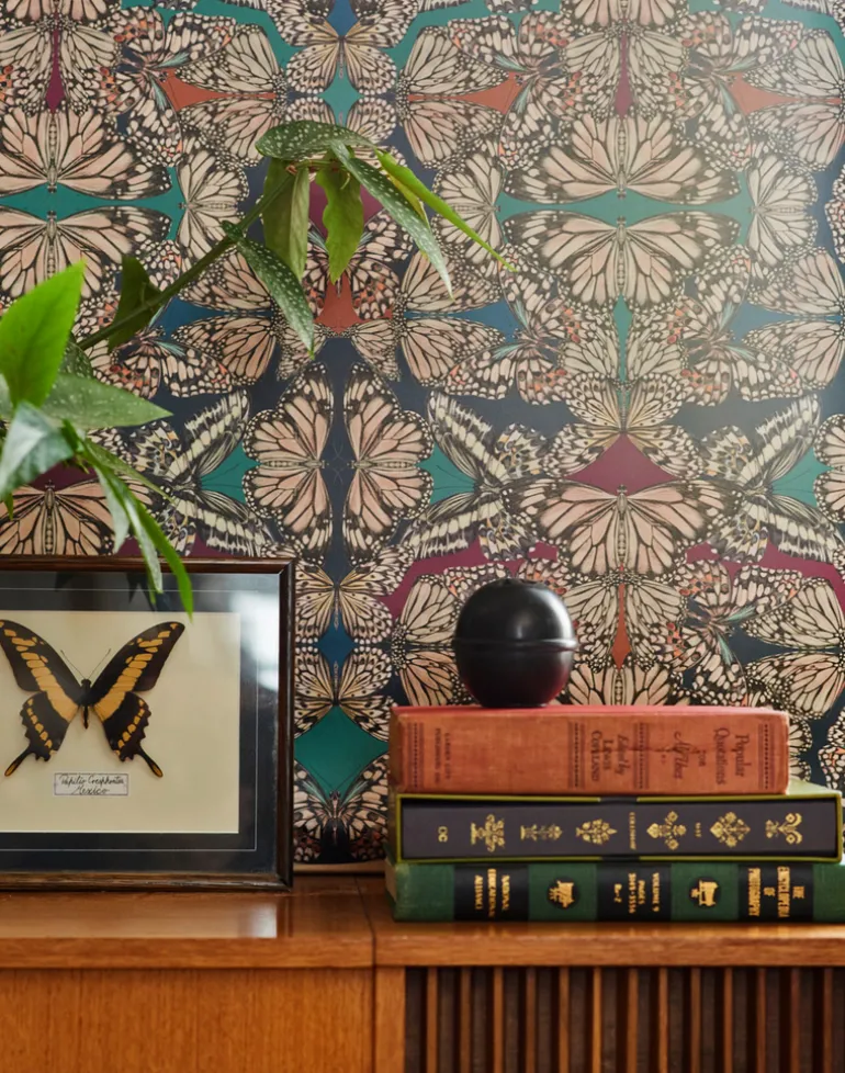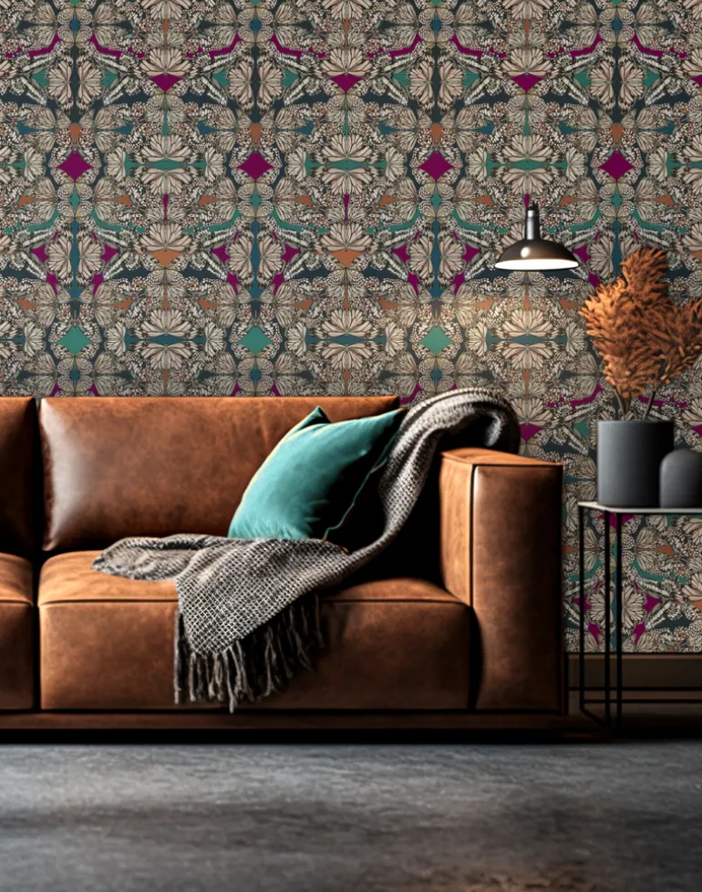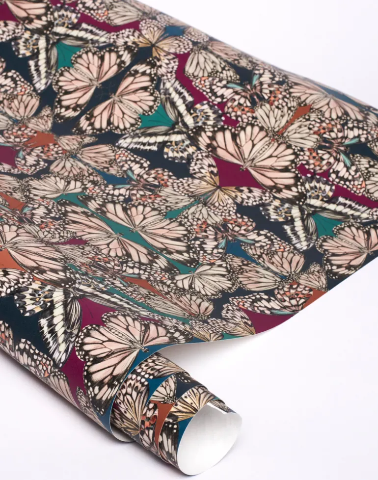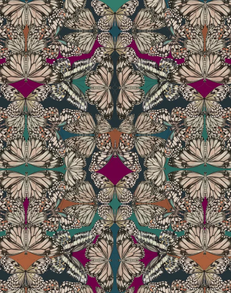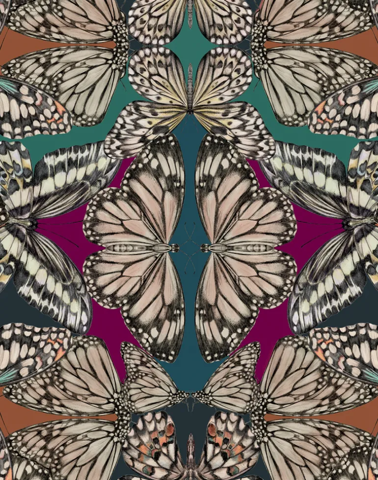 Step into this kaleidoscopic illusion, created from beautifully hand drawn butterflies. The Jewel color-way uses our brand signature color palette of Magenta, Turquoise, Petrol and Golden Sienna for a statement look.