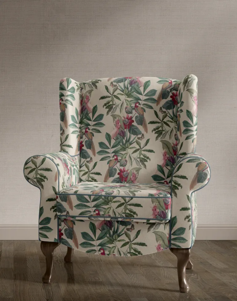 The Passiflora Collection is a wild and tropical labyrinth. Inspired by the Colombian rainforest, the detailed birds and butterflies are surrounded by oversized ferns deep in the tropics. The bold design is a large canopy creating a pattern that lures you into the South American jungle. Available in four colors, Ammonite, Antique, Sage and Vardo.
