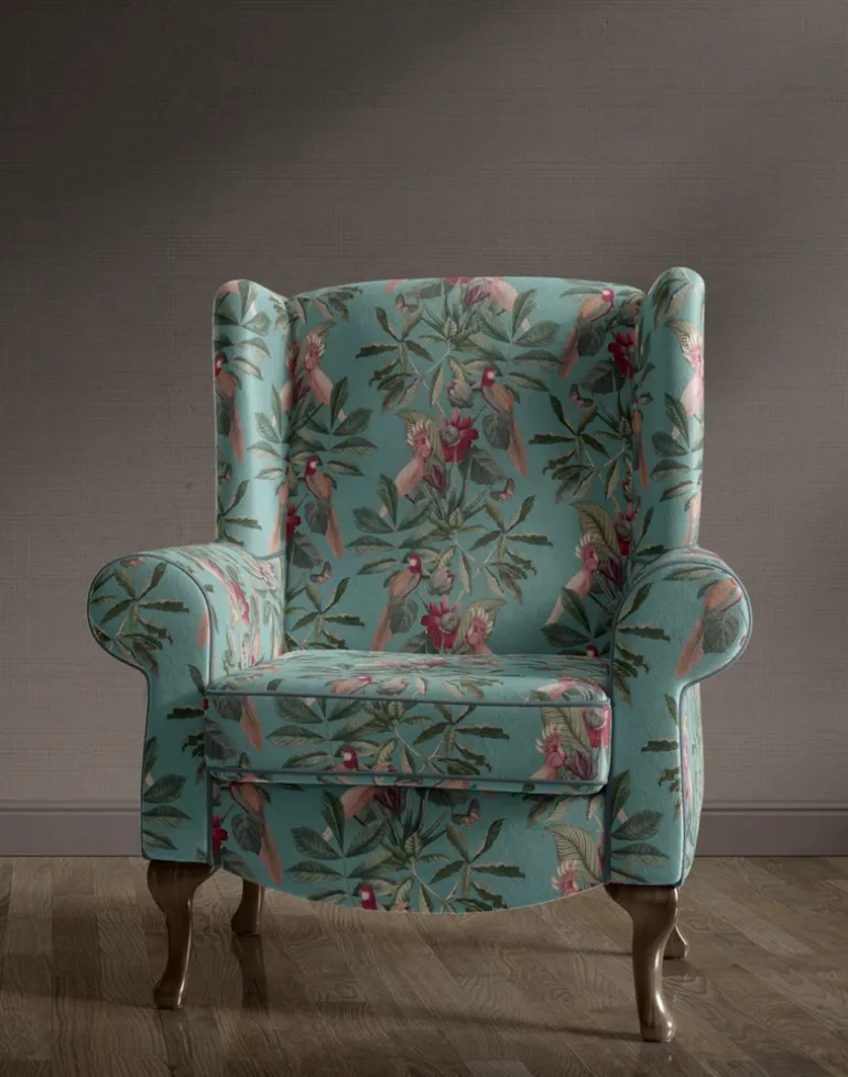 The Passiflora Collection is a wild and tropical labyrinth. Inspired by the Colombian rainforest, the detailed birds and butterflies are surrounded by oversized ferns deep in the tropics. The bold design is a large canopy creating a pattern that lures you into the South American jungle. Available in four colors, Ammonite, Antique, Sage and Vardo.