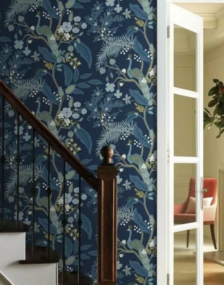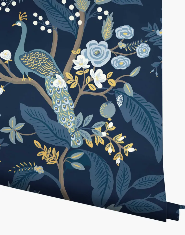 Magnificent peacocks perch on winding branches, surrounded by bright blooming flowers and emerald leaves. Inspired by traditional motifs, our modern take is both classic and playful. This wallpaper is screen printed and comes in 27 inch rolls with a 25.25 inch repeat.