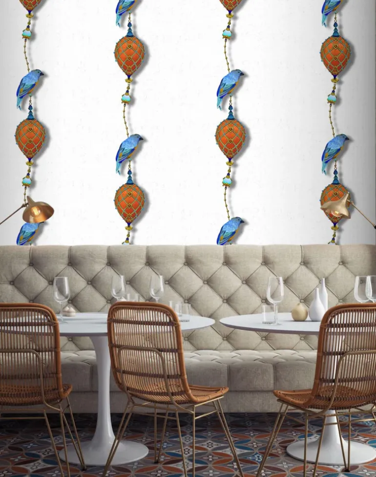 Pendants & Ornamental Birds is a whimsical reimagining of a classic stripe. Timelessly elegant strings of pearls form the basic vertical thread of the stripe motif, which is punctuated with a repeat of richly ornate jewels and exotic birds. Hand-drawn with our characteristic attention to detail, these highly rendered embellishments elevate the humble stripe to decadence. Generous spacing between the drawn elements allows the detail to shine, whilst the negative space imbues this wallcovering with a deep sense of order and calm.