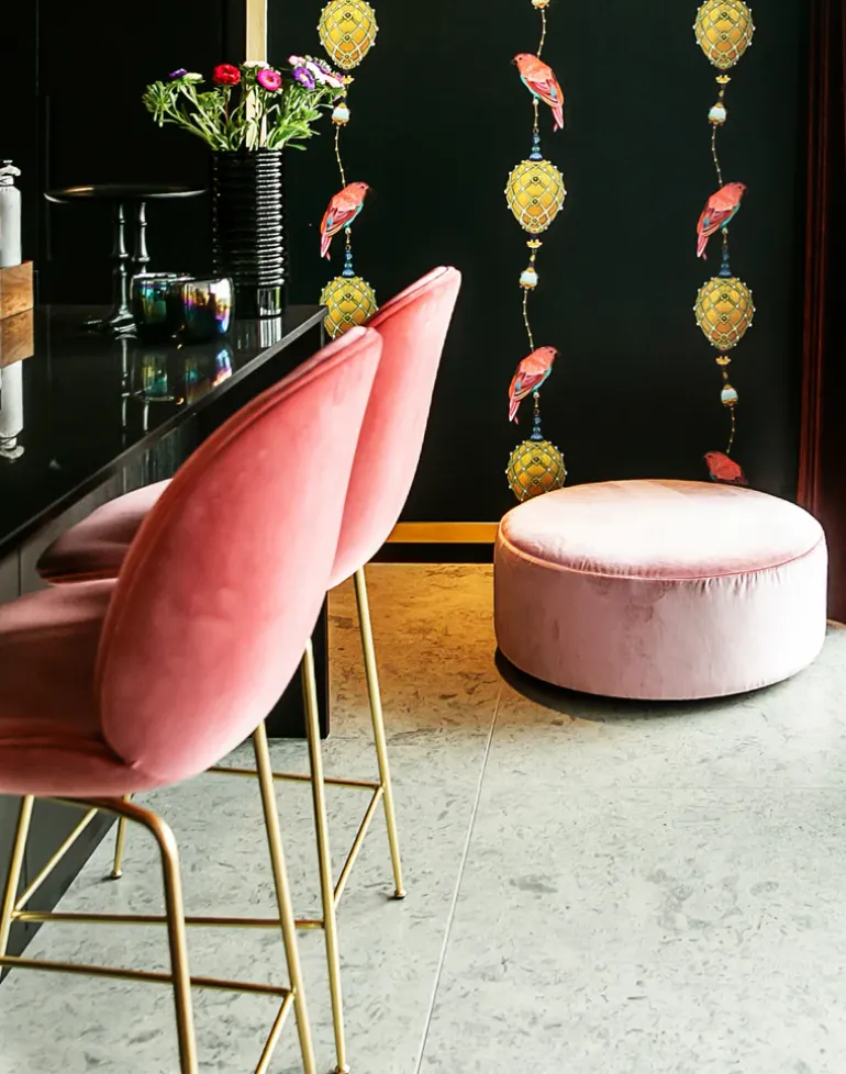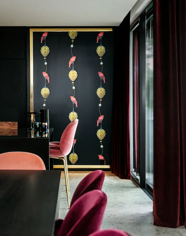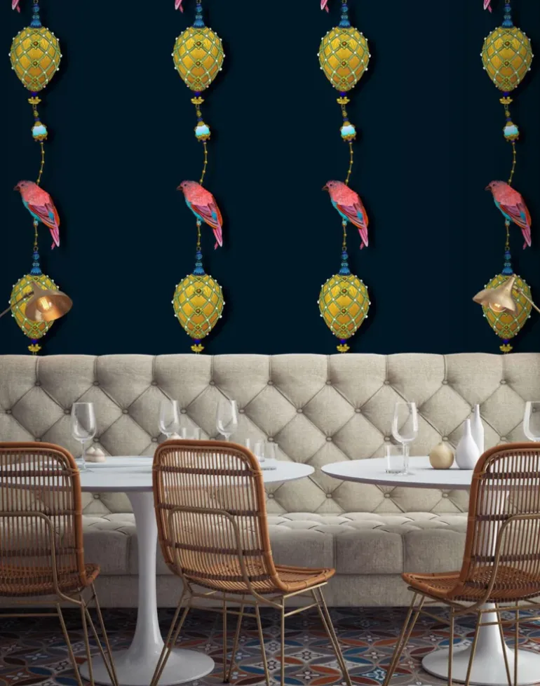 Pendants & Ornamental Birds is a whimsical reimagining of a classic stripe. Timelessly elegant strings of pearls form the basic vertical thread of the stripe motif, which is punctuated with a repeat of richly ornate jewels and exotic birds. Hand-drawn with our characteristic attention to detail, these highly rendered embellishments elevate the humble stripe to decadence. Generous spacing between the drawn elements allows the detail to shine, whilst the negative space imbues this wallcovering with a deep sense of order and calm.