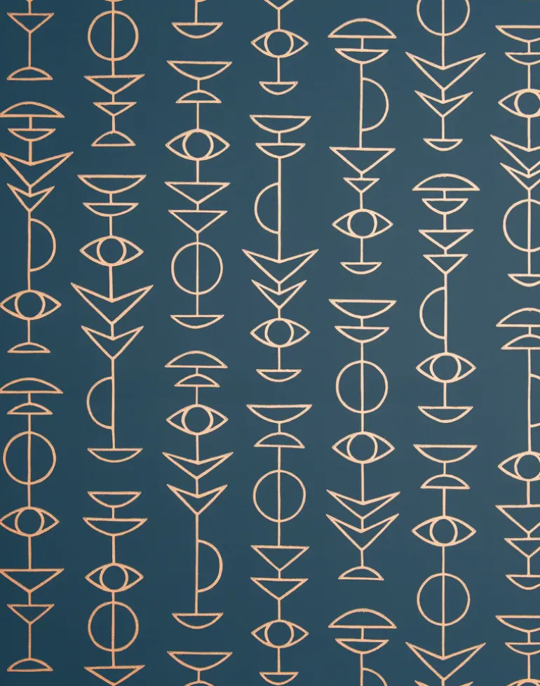 Inspired by geometry, elementary shapes and ancient symbols, the design creates vertical repeating hieroglyphs. The bold graphic pattern is highlighted by metallic inks and the tactile finish of a rich surface print technique. All MissPrint patterns were originally drawn by hand and developed in their own studio.