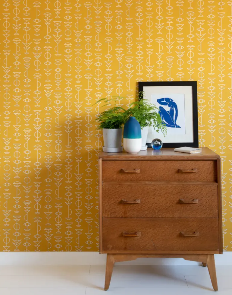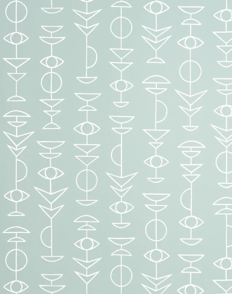 Inspired by geometry, elementary shapes and ancient symbols, the design creates vertical repeating hieroglyphs. The bold graphic pattern is highlighted by metallic inks and the tactile finish of a rich surface print technique. All MissPrint patterns were originally drawn by hand and developed in their own studio.