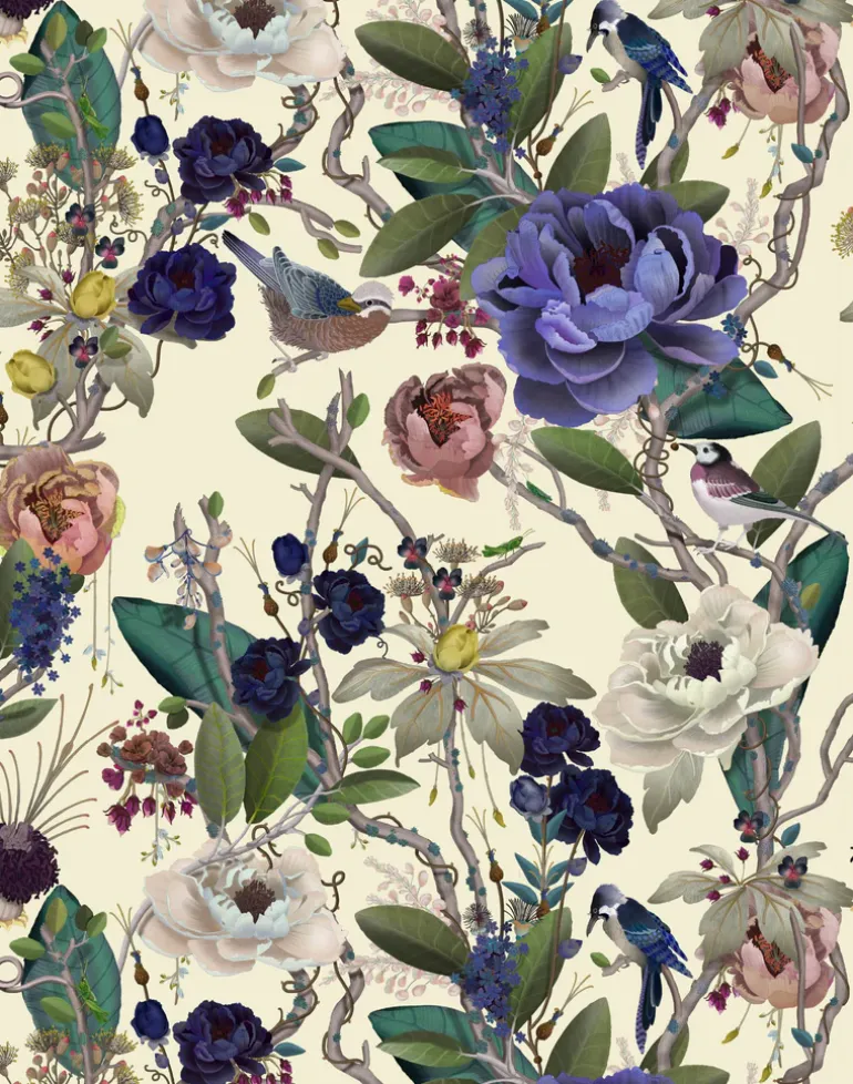Peony Japonica sees flowers awaken in a magnificent night blooming display. Layer upon layer of brightly colored petals open to reveal jewel-like stamens amidst their regal, delicate crowns. Known as ‘The king of flowers’, these Peonies grow among branches intertwined with tendrils of blue wisteria, coiling lyrically between birds and leaves. Shocks of brilliant oranges, pinks, and blues that leap from muted tones let the finer details of this composition sing up close as well as from a distance. This large-scale wallcovering packs both subtlety and impact.