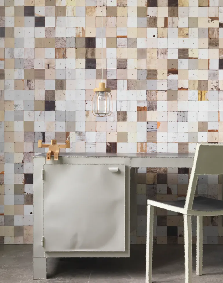 Three years after the launch of the original Scrapwood Wallpaper collection we are proud to introduce a renewed cooperation with designer Piet Hein Eek to create ‘Scrapwood Wallpaper 2’. The new collection consists of 8 designs and is based on the ‘waste’ furniture collection by Piet Hein Eek. It includes new elements like beams, cross wood and plank sides. Piet Hein Eek: “This new collection complements the previous one. For this first collection we just scanned some planks from my workshop and brought it to market. This time we aimed for a more conceptual approach. Working on this collection turned out to be much more interesting than the first time. We also chose a new, super luxurious matte finish so the wallpaper looks even more realistic than before.