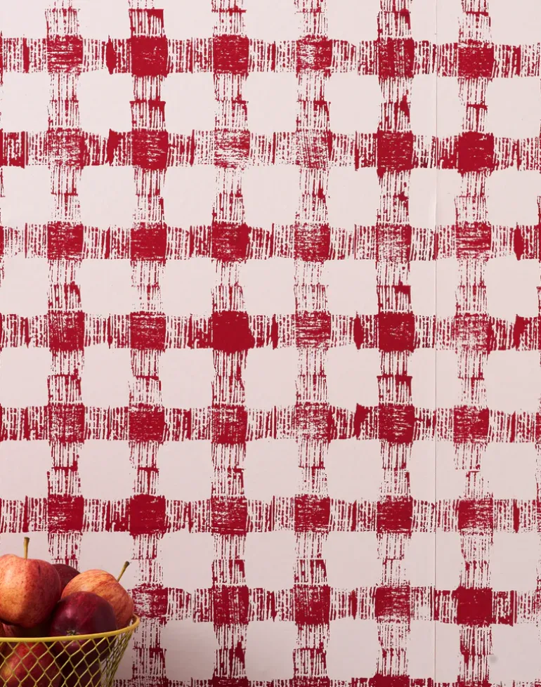 Red illustration on a taupe background