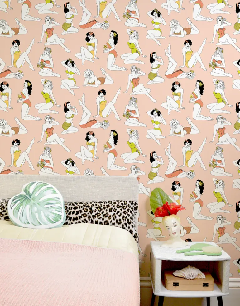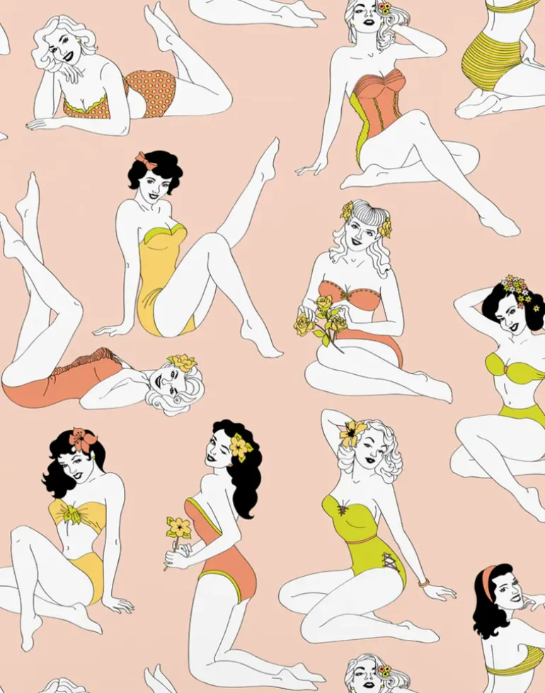 This boutique Pin-Up wallpaper by Dupenny is a nod and a wink to the great American pin-up artists and models of the past. If you’re a fan of the works of Gil Elvgren, Alberto Vargas and George Petty then this wallcovering is for you! Allow these buxom bombshells to brighten up the bedroom, boudoir and beyond. This pastel pink color way is perfectly soft and girlie, for the ultimate in feminine decor.