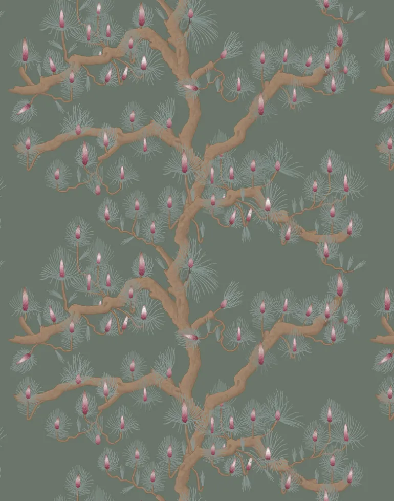 Pine Forest negotiates between wild naturalism and orderly repetition in an impressive yet calming design. Finely drawn needles scatter out like sparks from seed pods. They adorn gnarly, textured bark which almost seems as if it is peeling, giving the design a tactile dimension. The rhythm and repeat of the twisting branches and candle-like pines suggest an ornamental forest marvelous in scale that is augmented by a muted, sophisticated palette. The pared-back simplicity of the motif brings a sparseness and serenity to the composition.