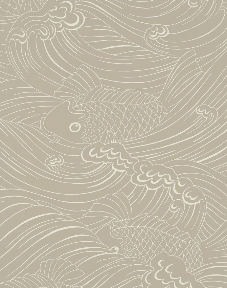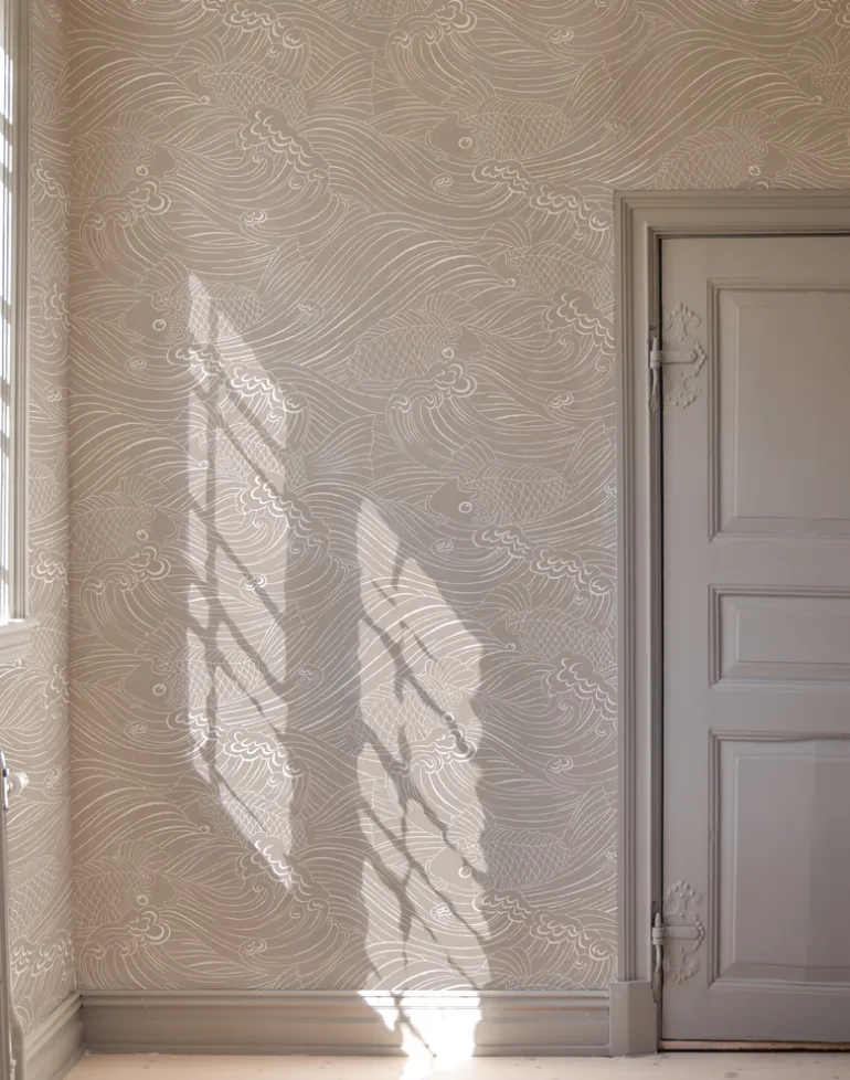 With inspiration from old woodcut techniques this seemingly simple design veils an intriguing play with lines where fish hide in a wavy sea.