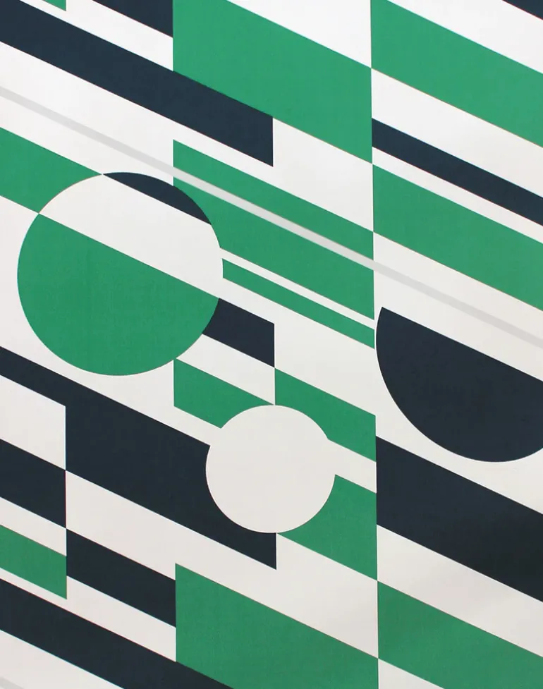 The pipeline is represented by a continuous silver line, running diagonally across a background inspired by ‘dazzle’ camouflage featured on military vessels during the two world wars.