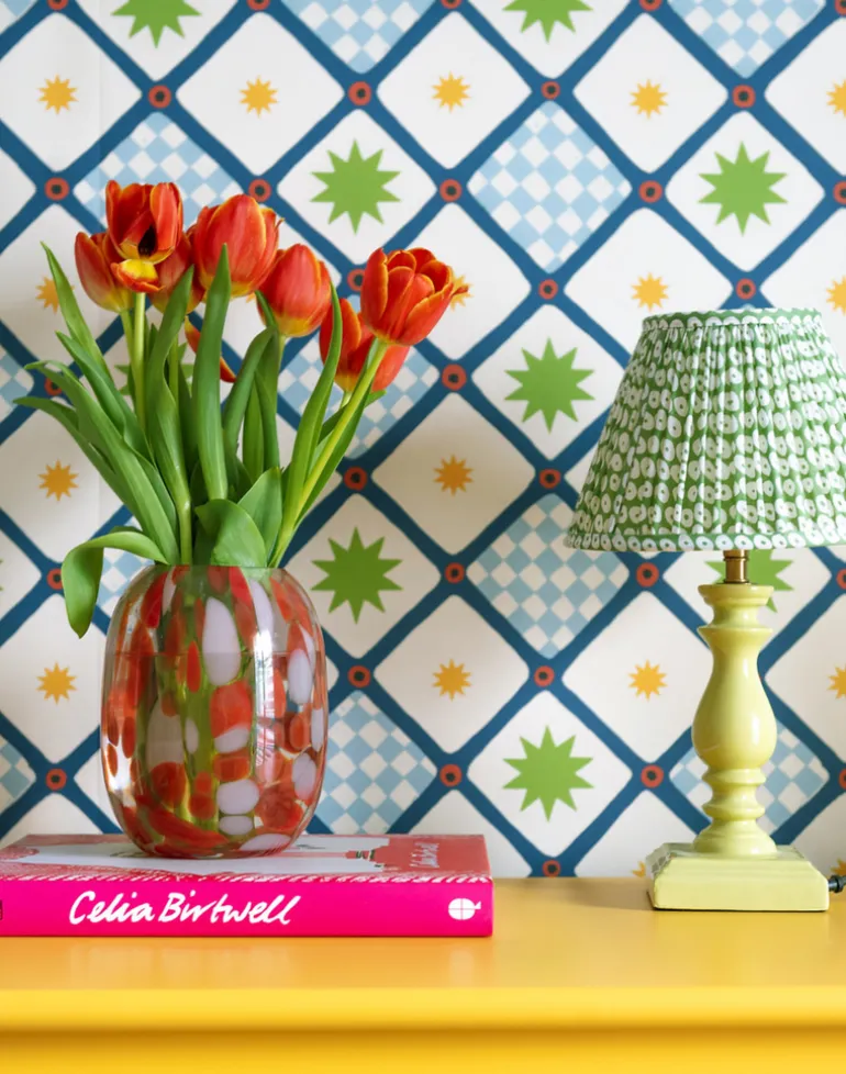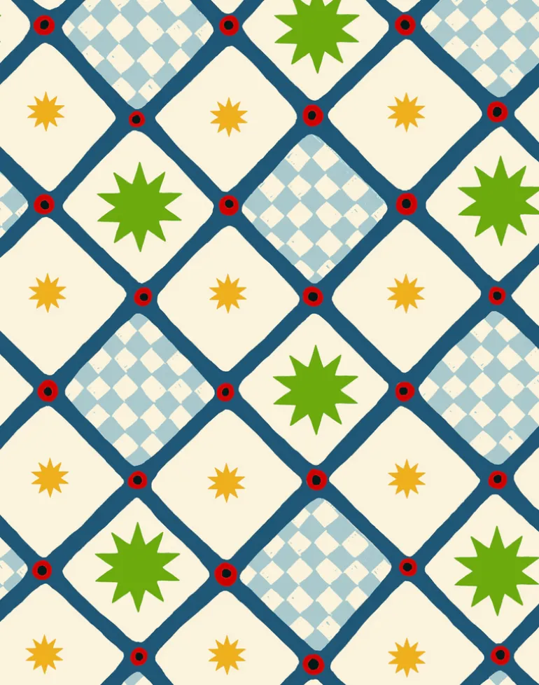 Our Polaris Wallpaper in Primary draws inspiration from the intricate geometric tiles and mosaics of Morocco. The design weaves together a harmonious blend of geometric precision with celestial charm. Named ‘Polaris’ after the North Star its name comes from the the word Stella Polaris meaning Pole Star and is historically significant for navigation. Symbolically it represents guidance, consistency and direction. Colored in vibrant primary tones reminiscent of the piles of beautiful piles of spice lining the markets of the medina.