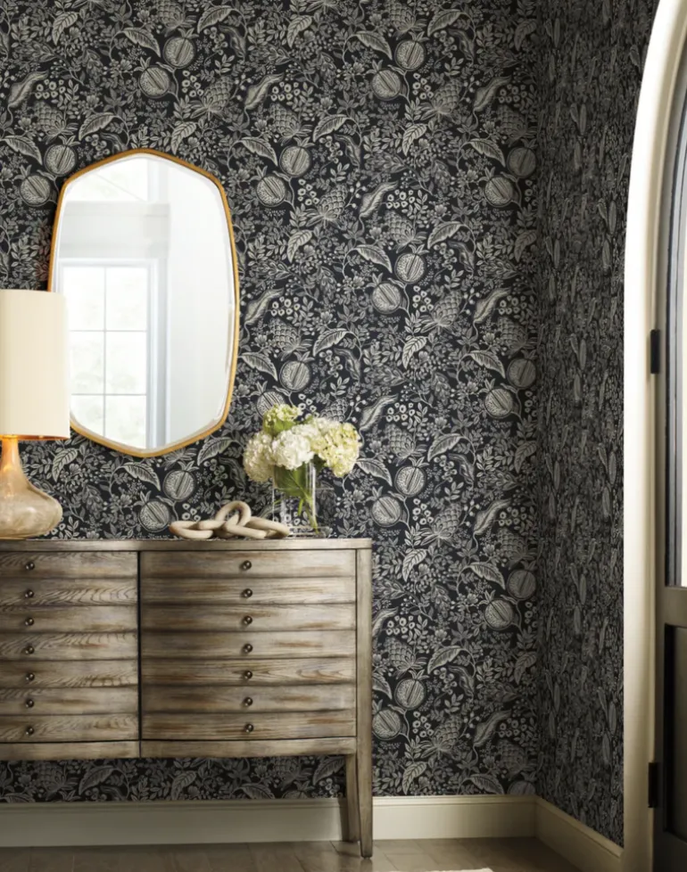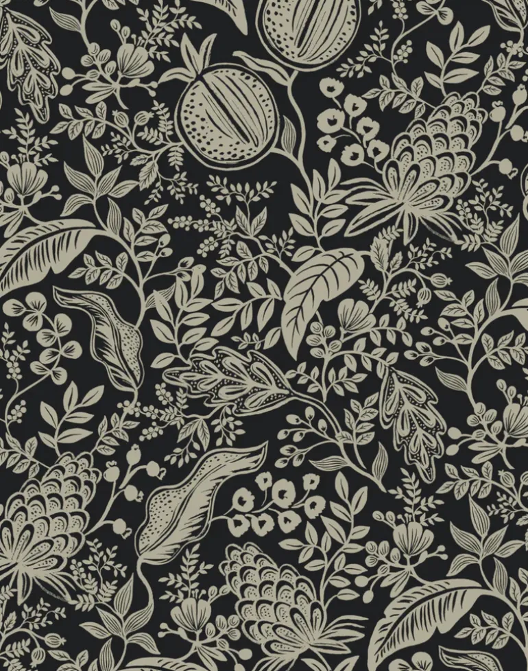 Luscious pomegranates are arranged in a canopy of tropical foliage and presented in two-color prints that feel elevated and modern. This wallpaper is screen printed and comes in 27 inch rolls with a 25.25 inch repeat.