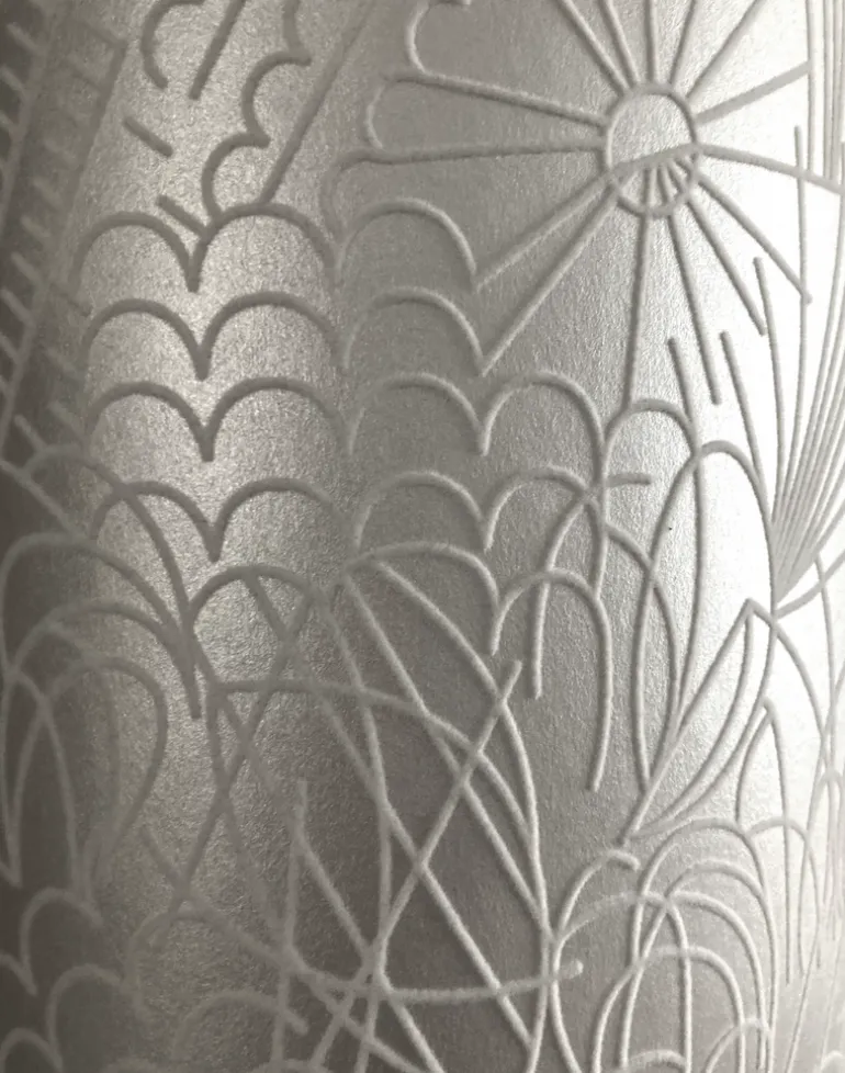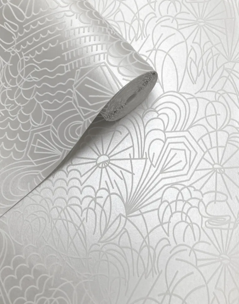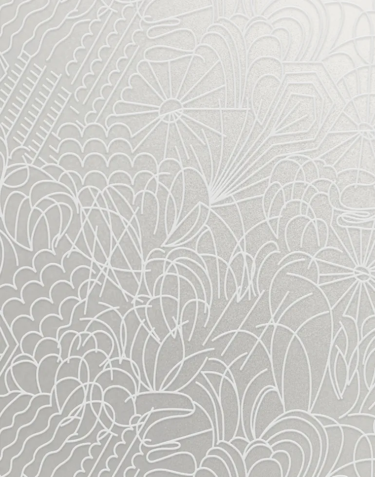 A white flocked wallpaper pattern, on a lustrous silver, heavy weight non-woven ground.