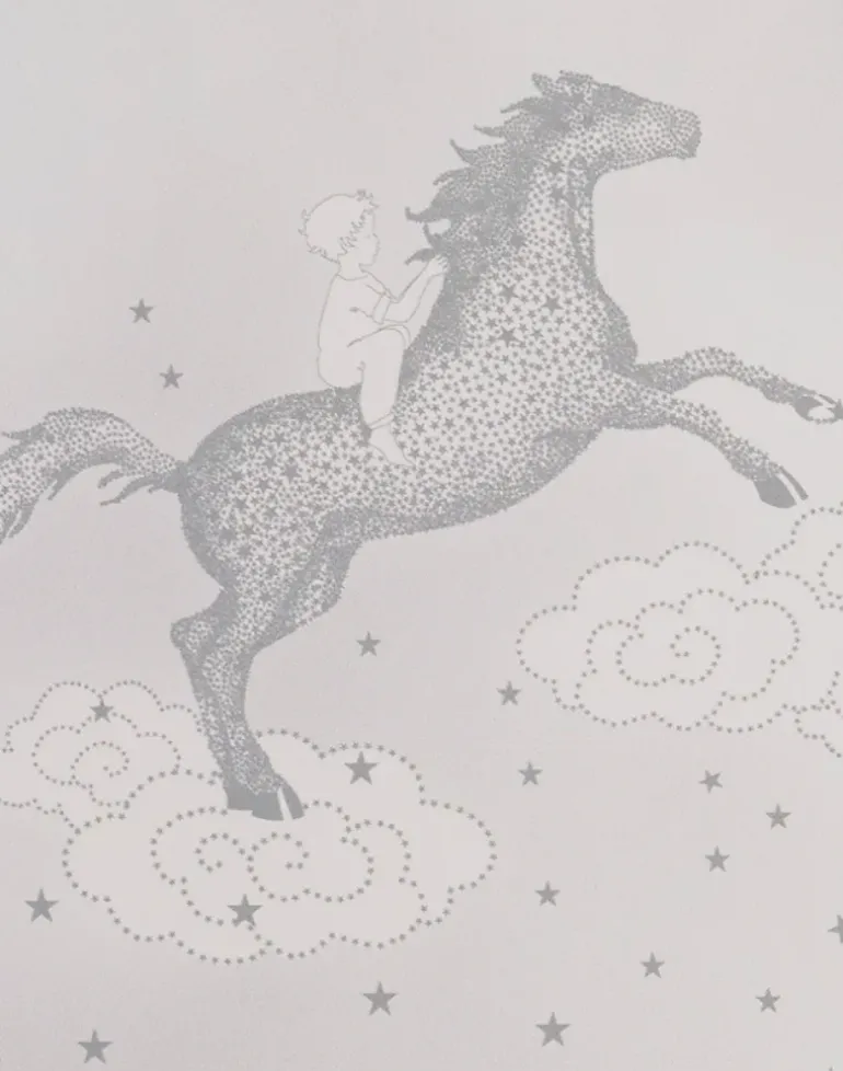 Riding in the night sky on a stardust horse, Popcorn is a beautifully illustrated story wallpaper available in 3 gorgeous colors, Popcorn Pink (Dust Soft Pink), Popcorn Blue (Dust Soft Blue). Popcorn Grey (Dust Dove Grey)