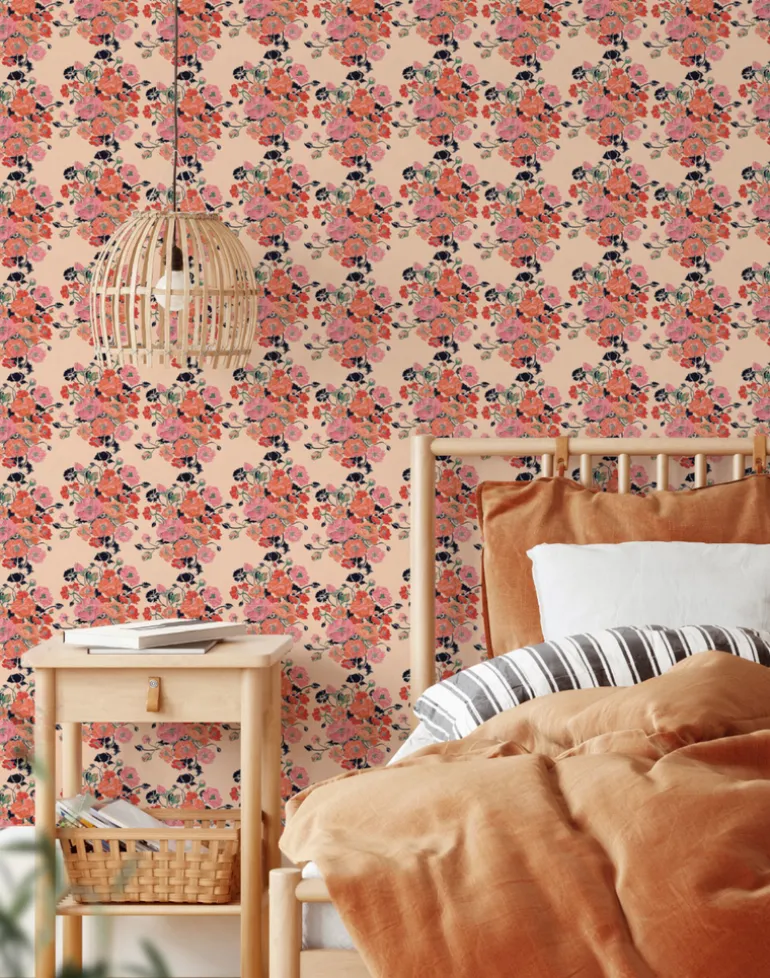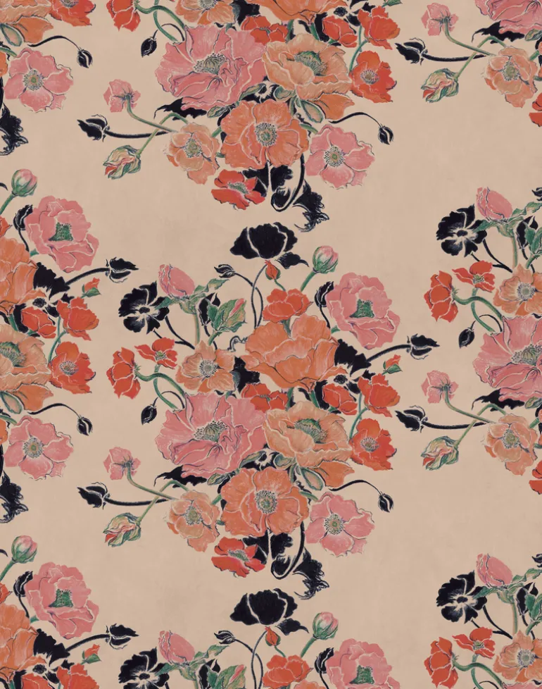 The Poppi pattern is an Art Nouveau–inspired pastel drawing of a playful posy of blooming poppies. With its hand-drawn strokes and subtle stone background texture, this artwork provides a warm, joyful energy.