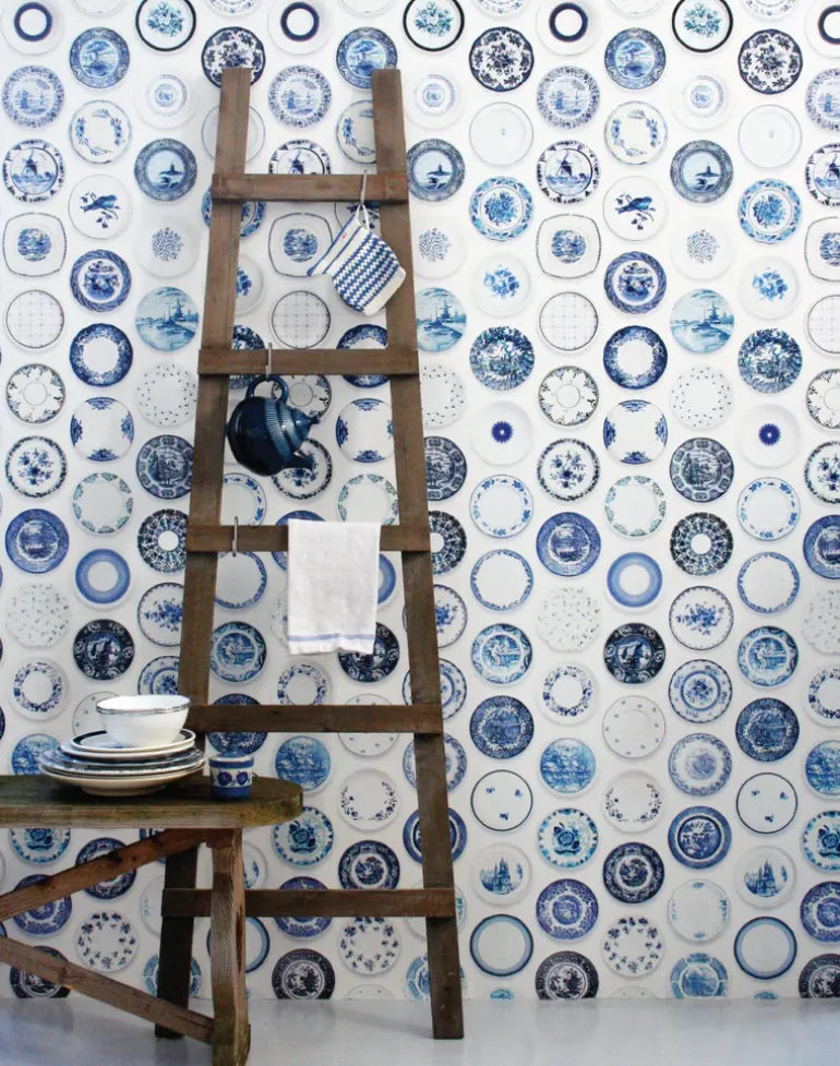 This porcelain wallpaper is totally inspired by blue tableware. Different shades of blue and graceful scenes gives the wallpaper a nice old Dutch feeling. The modern pattern makes it a wall decoration from today for any contemporary interior.