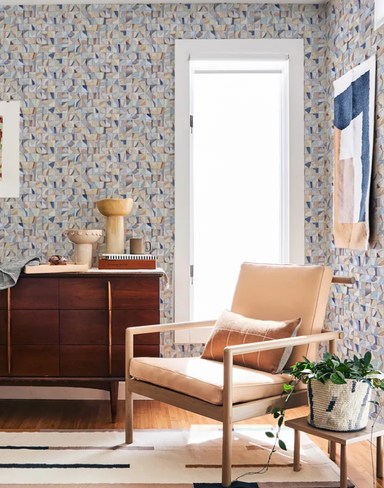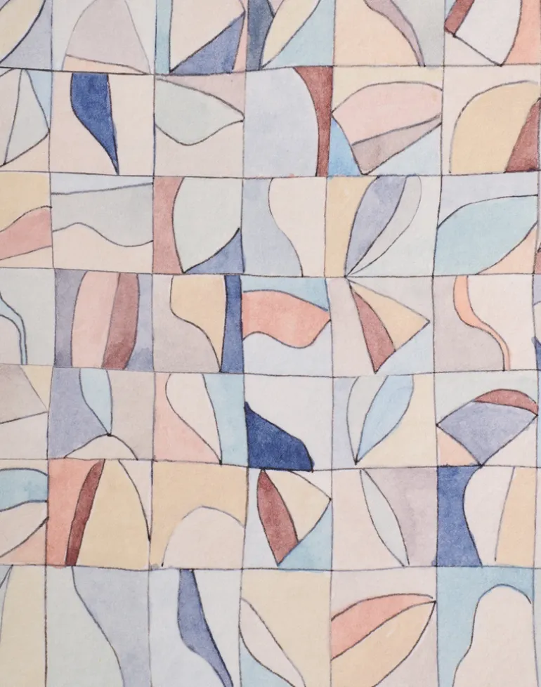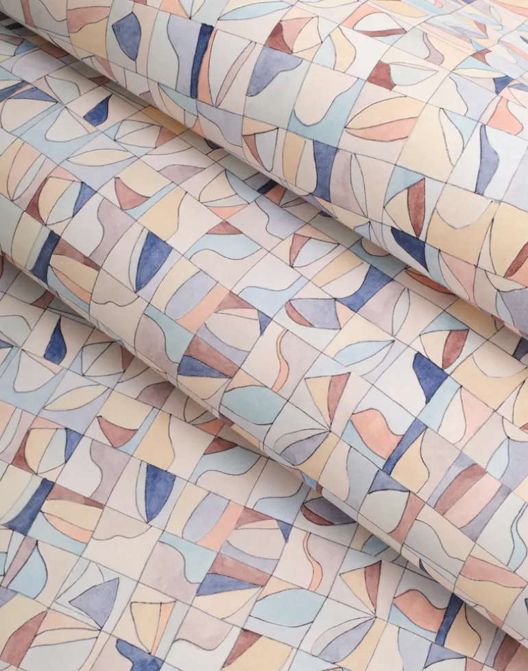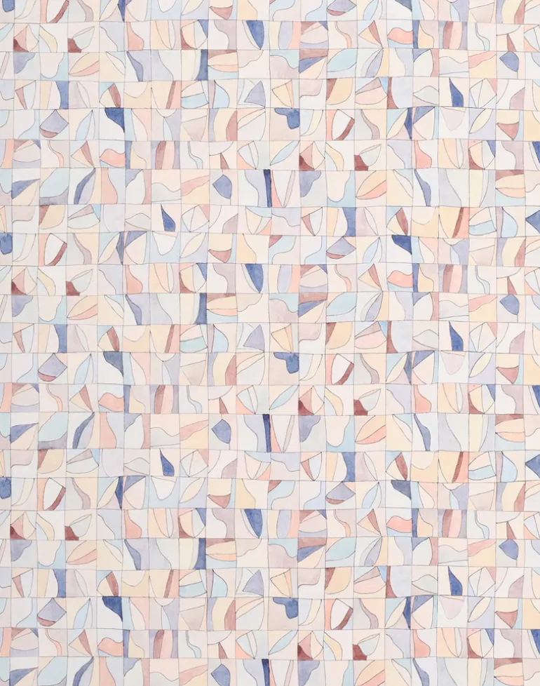 Portals, the namesake of our first wallpaper collection, is filled with rounded, organic shapes and curves that fill segments of a grid structure, each small window offering its own abstract view in dusty, moonlight tones. Suitable in small and large spaces alike.