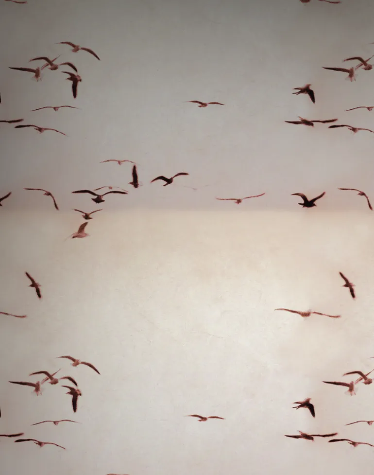 To create the nostalgic mood of this piece, the Artist captured a flock of seagulls wheeling high above the Lisbon coast.