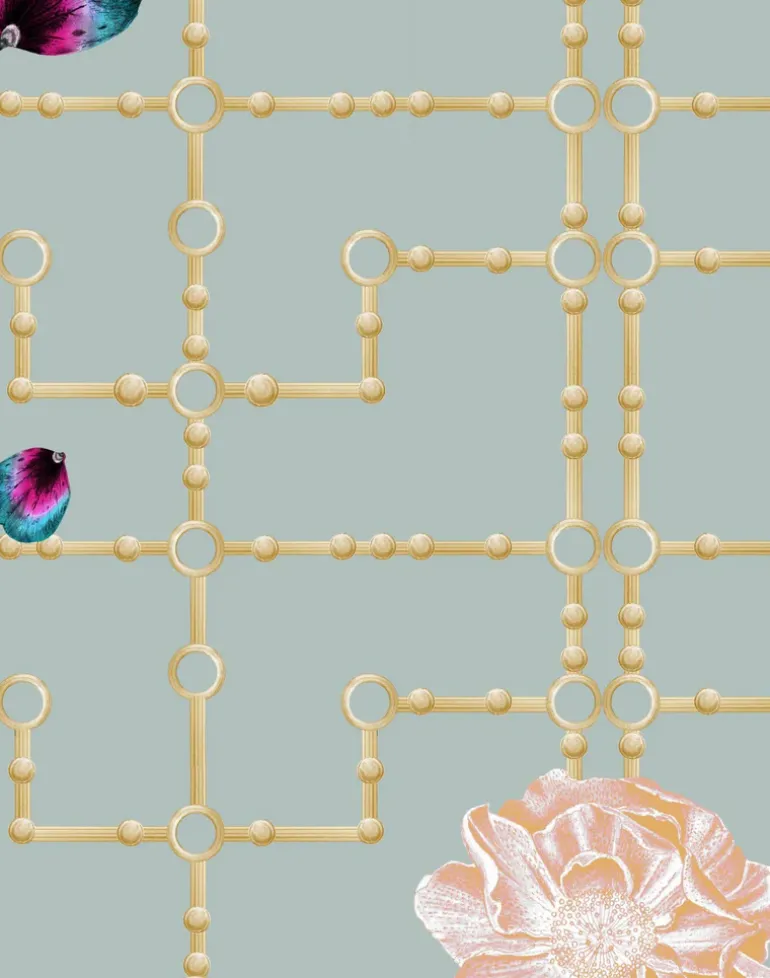 Quinn Orchid is a surreal scene that draws together opulent design and delicate nature. A fretwork of brilliant gold structures a geometric architecture. Fine pansy petals float down in front and behind the frame, giving the subtlest hint of dimension to the space. Ornate, monochromatic camelias embellish the fretwork, their seemingly carved nature marrying the beauty of the natural world with the artisanship of the decorative arts. Whilst sumptuous in subject matter, the sparing use of each element imbues the design with an elegant restraint.