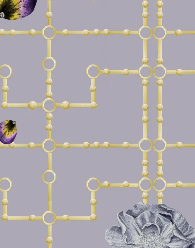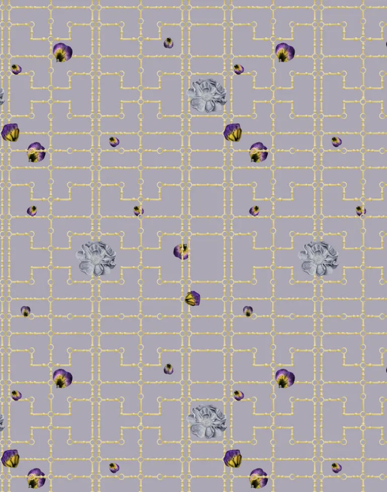 Quinn Orchid is a surreal scene that draws together opulent design and delicate nature. A fretwork of brilliant gold structures a geometric architecture. Fine pansy petals float down in front and behind the frame, giving the subtlest hint of dimension to the space. Ornate, monochromatic camelias embellish the fretwork, their seemingly carved nature marrying the beauty of the natural world with the artisanship of the decorative arts. Whilst sumptuous in subject matter, the sparing use of each element imbues the design with an elegant restraint.