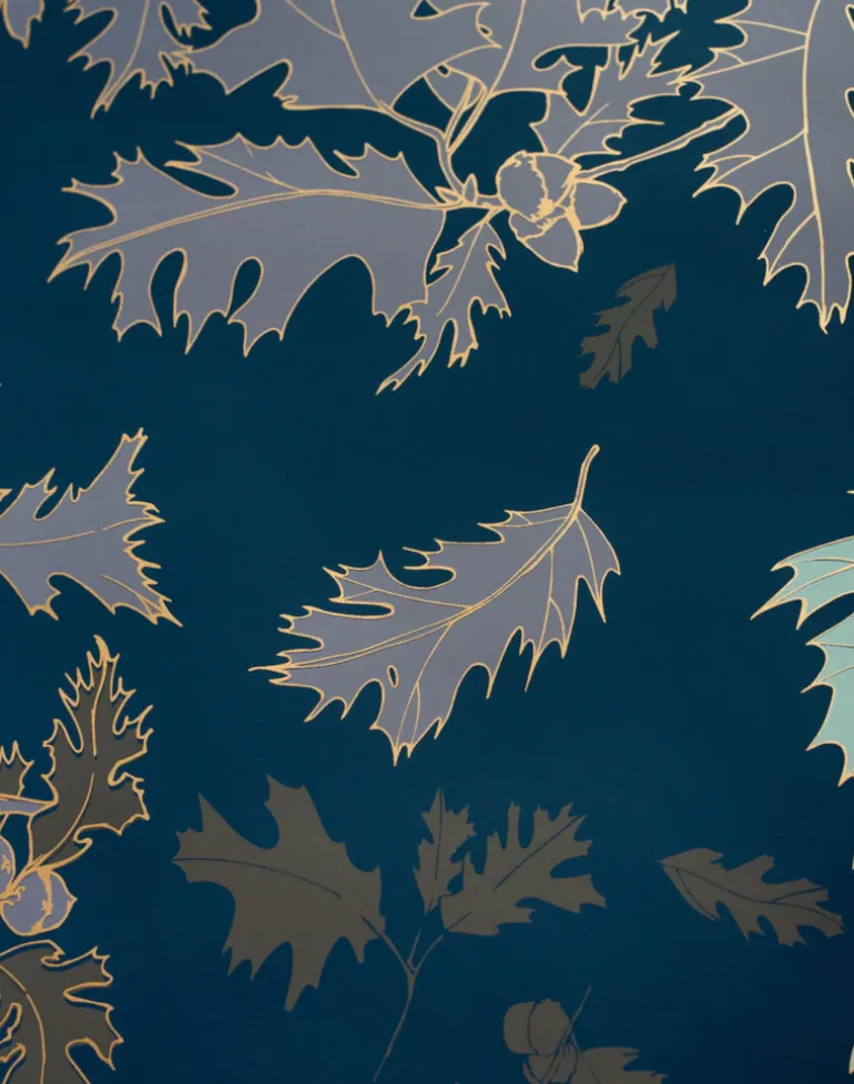 Black Oak trees are said to represent strength, morale, resistance and knowledge. They certainly exhibit survival in their natural landscape here in California. This wallpaper pattern with its subtly layered leaves and budding acorns is an homage to resilience and family and the value of the important traits the oak tree stands for. On a wall, Ramón creates depth and a wonderful backdrop for your favorite family photos. Look closely for the solid gold leaf that pulls it all together.