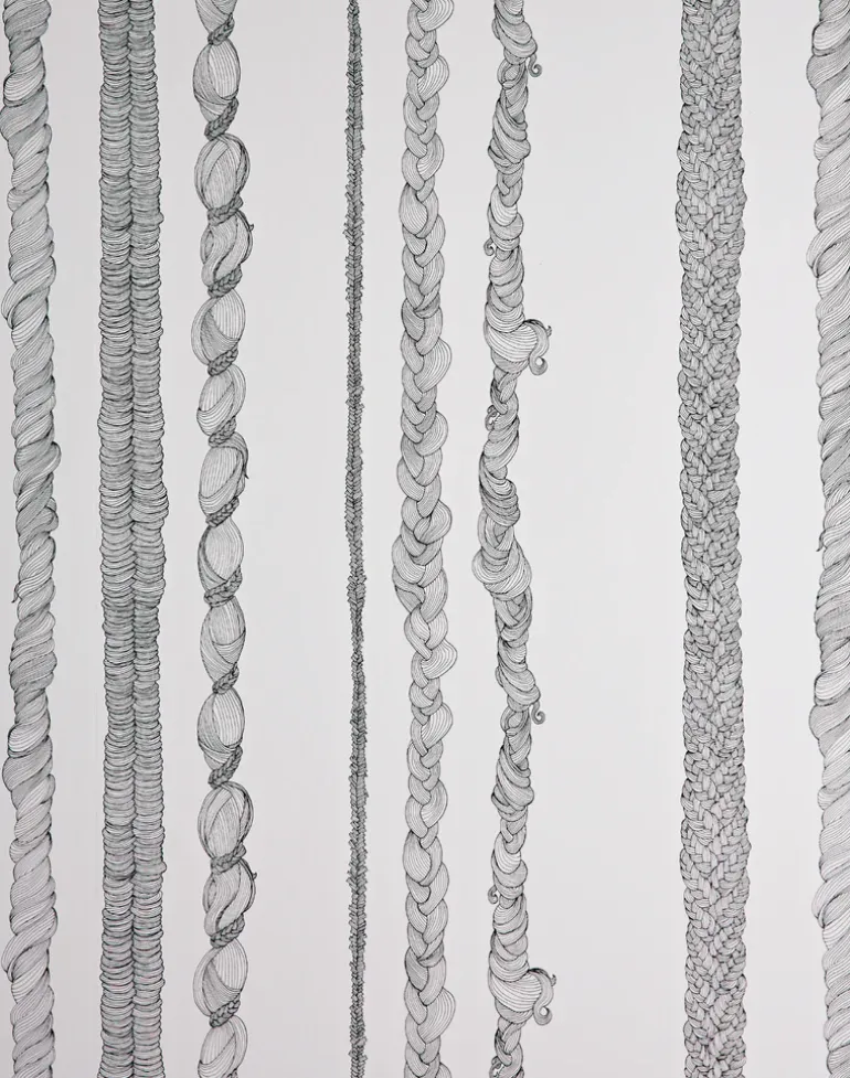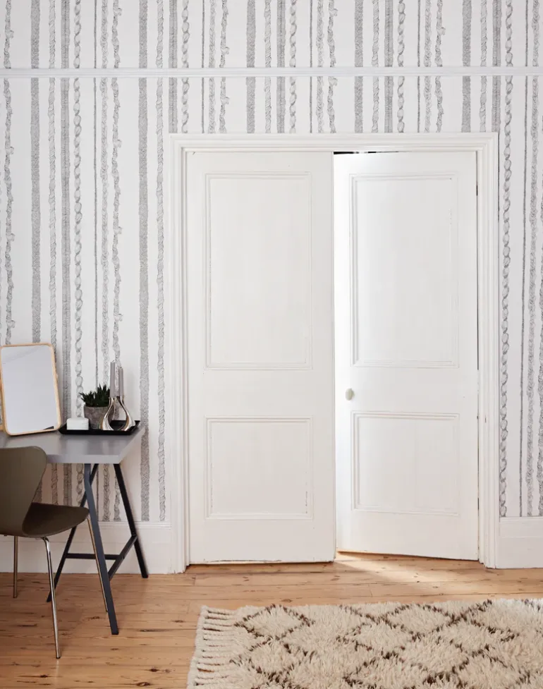 From a distance Rapunzel Stripe appears to be a classic monochrome striped wallpaper but on closer inspection the stripes are hand drawn plaits of hair, creating a contemporary, fairy tale inspired version of the traditional stripe.