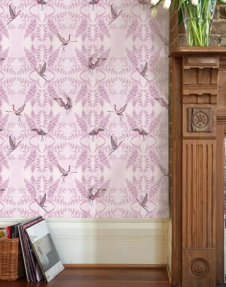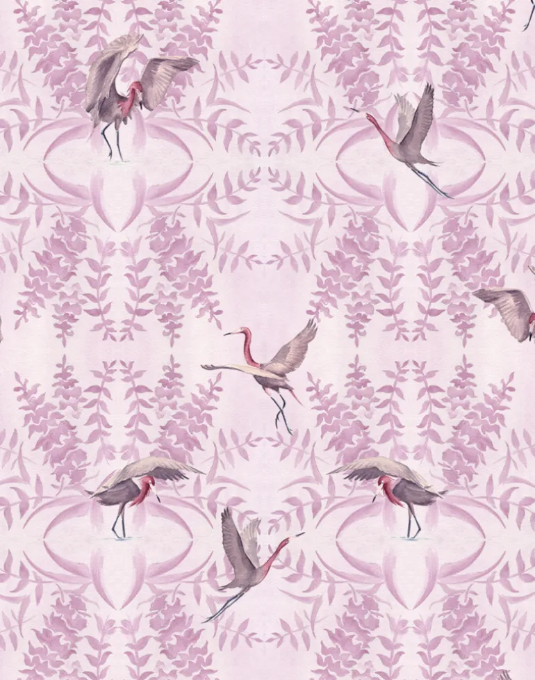 Egrets in various stages of flight are framed by stylized botanicals in lilac tones. The birds’ pale burgundy and soft grey feathers add an earthy touch to this serene wallpaper pattern.