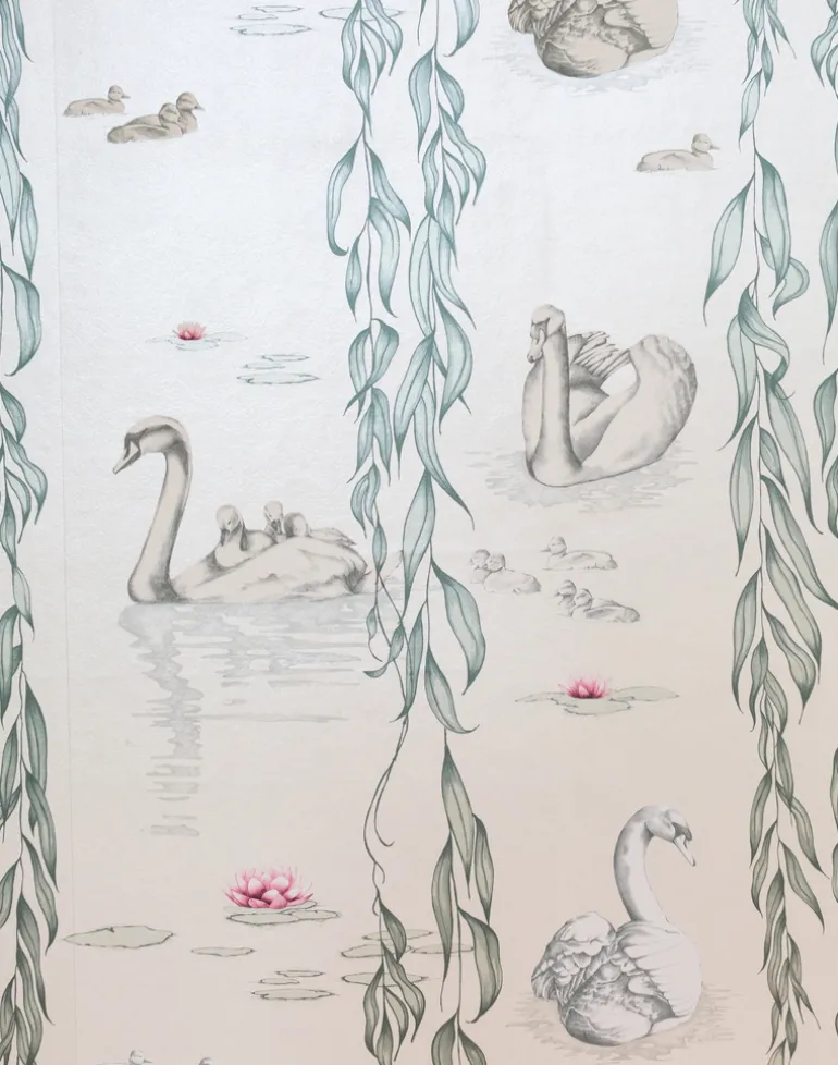 With our studio based in Kensington, London, this design is inspired by the elegant swans that swim in the Serpentine in Hyde Park. Swans are known to mate for life so we have recreated this typical scene with several adults swimming with their signets. The Royal swans are no longer marked, but an unmarked mute swan on the Thames is still regarded as belonging to Queen Elizabeth II by default.