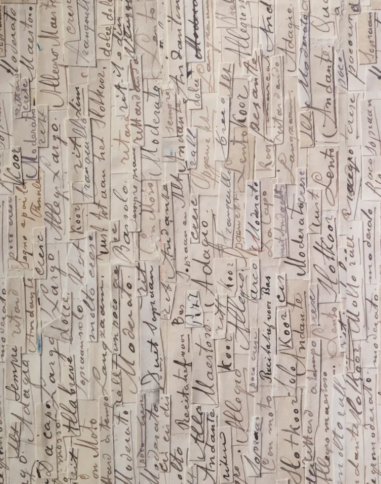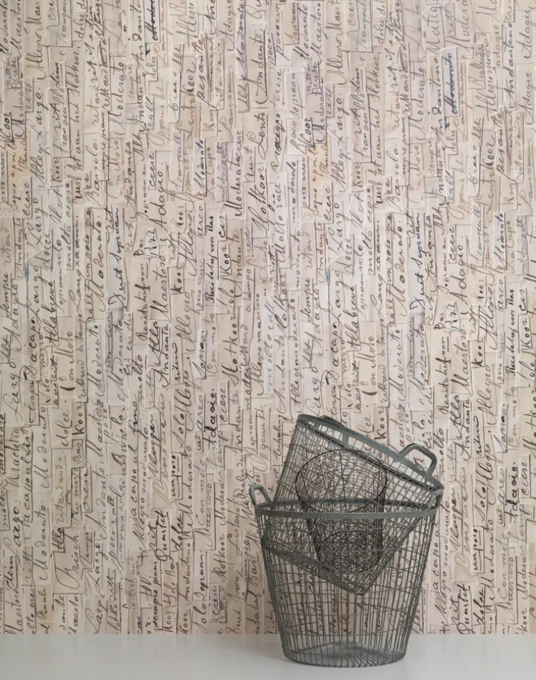 Arthur Slenk: “This work is my “magnus opus” – and I don’t just give it to anybody. The designers at NLXL treated my designs with the respect I had hoped for. I am truly amazed by the end result.” The sheet music was sorted into seperate envelopes, by subject, then finally pasted. Each design was critically examined, often followed by corrections. The artist worked on it every day. After seven years and 144 designs he considered this gigantic collage completed. NLXL has selected 8 of these designs for a new wallpaper collection. The result is simply incredible. New state of the art scan techniques have been developed to capture the depth of the paper clippings. The vintage feel of the yellowed paper combined with the history behind the sheet music makes it look like a historical document on a wall.