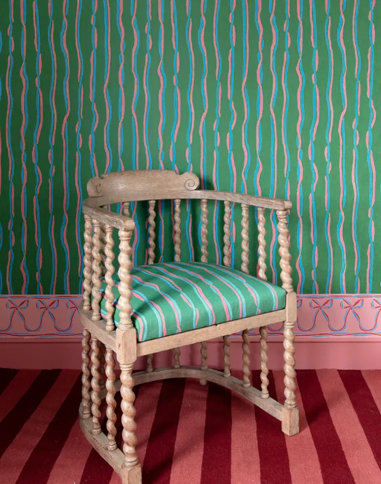 This ribboned wallpaper, designed by artist Susie Green makes a wrapping for a room and/or the person in it. Playing with the idea of wallpaper as interior wrapping paper these unravelling ribbons, inspired by the Regency stripe, entwine us with our environments. Available in three colorways.