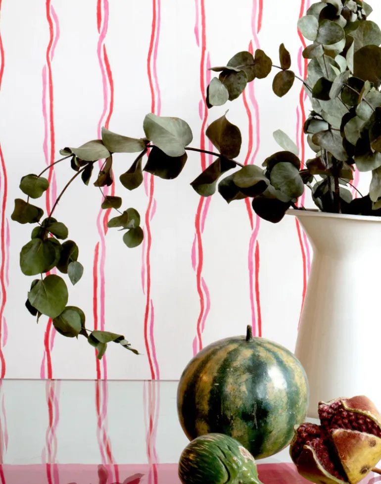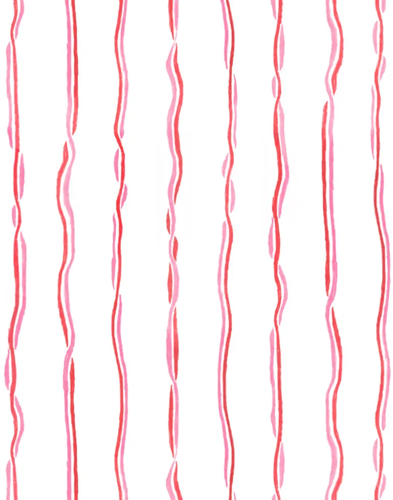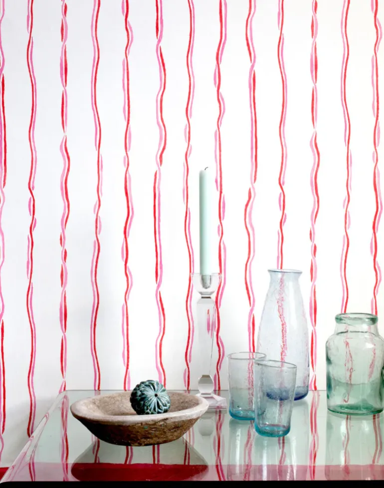 This ribboned wallpaper, designed by artist Susie Green makes a wrapping for a room and/or the person in it. Playing with the idea of wallpaper as interior wrapping paper these unravelling ribbons, inspired by the Regency stripe, entwine us with our environments. Available in three colorways.