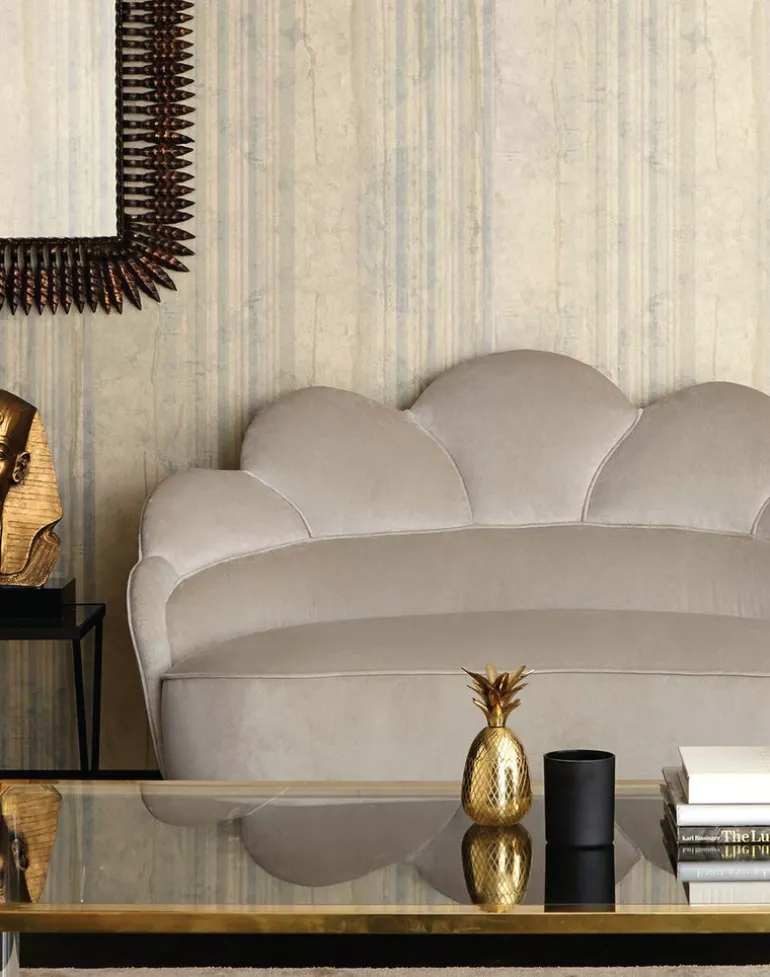 Influenced by the Eternal City, British artists, Paris and Nosca Inc, deliver a fresh interpretation of the classic interior stripe with this beautiful Rome Deco collection. Marble textures merged with vertical stripes of varying scales forge the backbone of this sophisticated design. To create juxtaposition between traditional beauty and decay, the original artwork was suspended from a window, with paint poured down onto it, to allow gravity to imbue its own delicate stripes and textures into the composition. 17 Patterns introduces metallic shimmers across this opulent collection of white, sand, rust and charcoal mica editions.