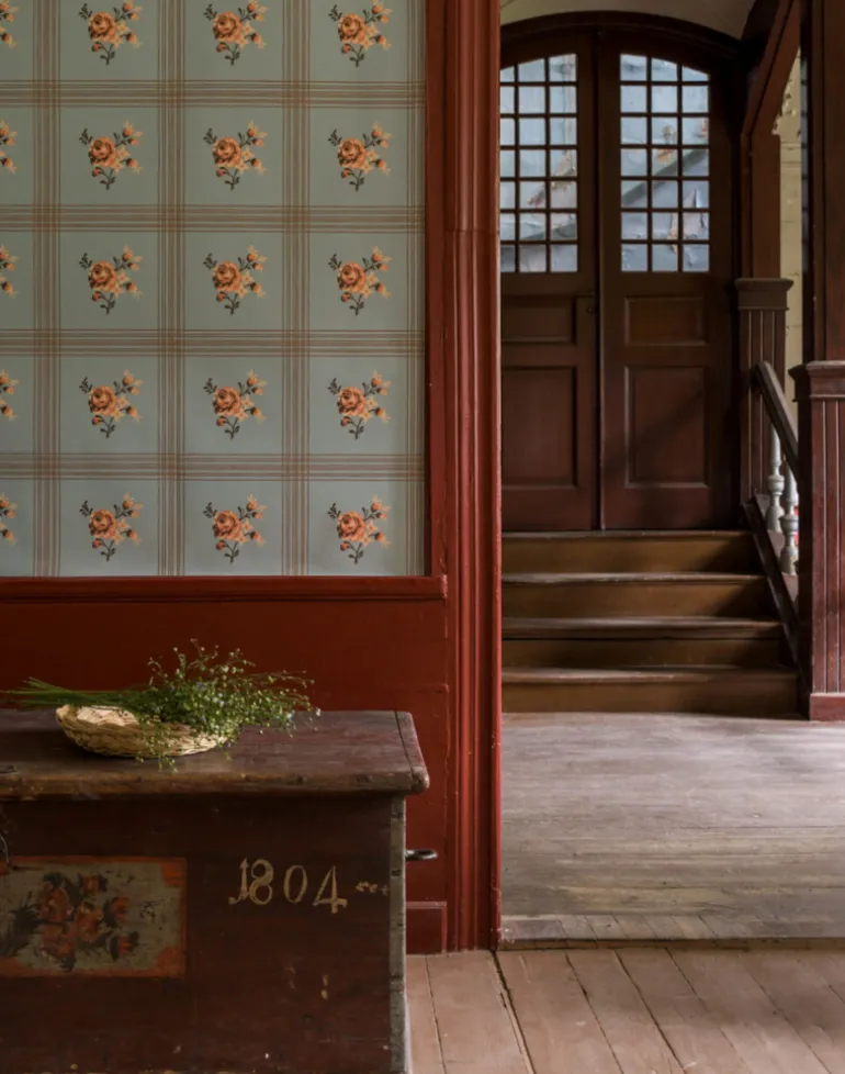 This rose is borrowed from an 18th-century Swedish wallpaper. When positioned within this large scale check pattern with its strict repetition, it resembles tiles adorning the wall.