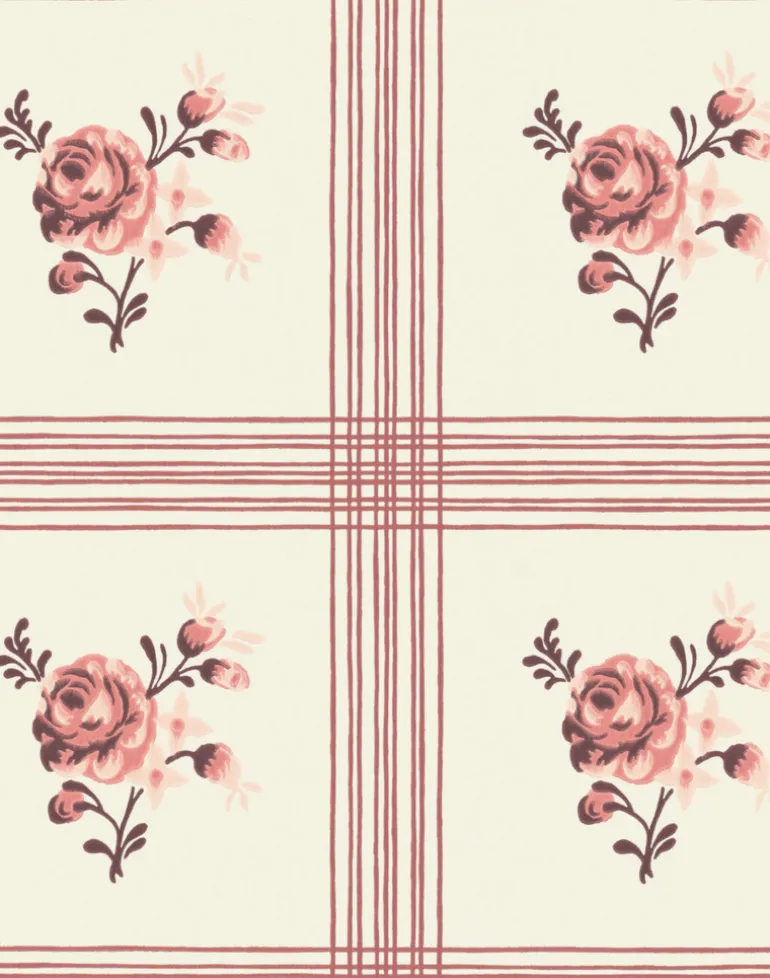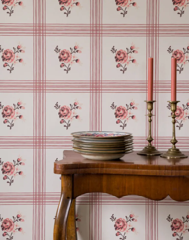 This rose is borrowed from an 18th-century Swedish wallpaper. When positioned within this large scale check pattern with its strict repetition, it resembles tiles adorning the wall.
