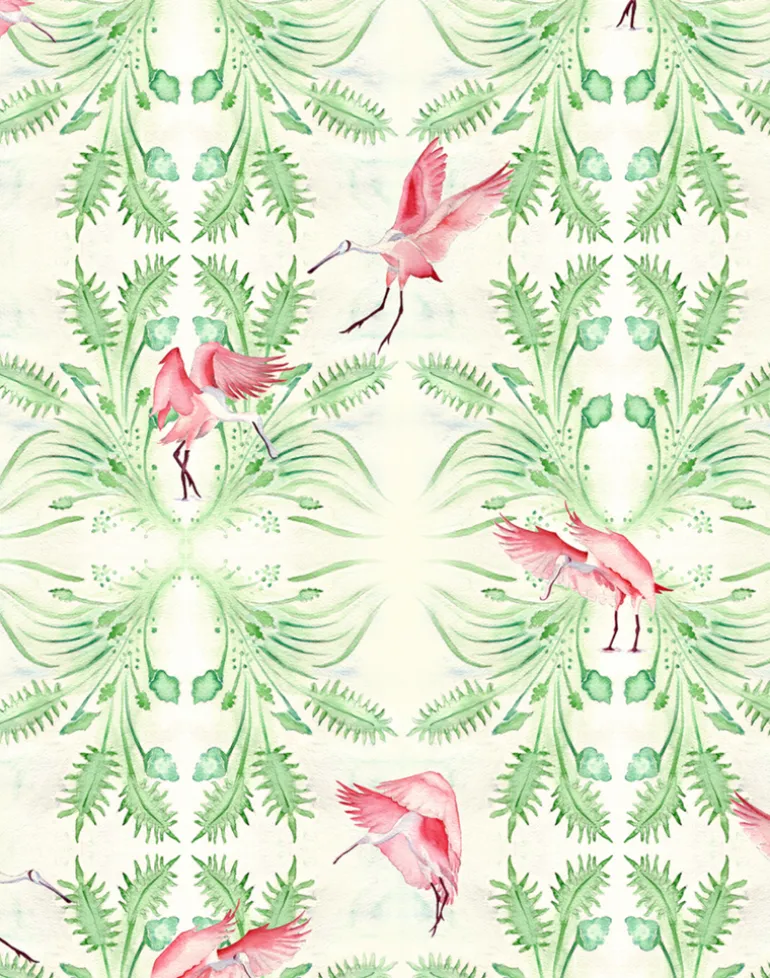 Elegant pink spoonbills fly and fish in various poses against an emerald green background of stylized tropical foliage. This contemporary wallpaper pattern is a great choice for a modern beach house or any tropic inspired room.