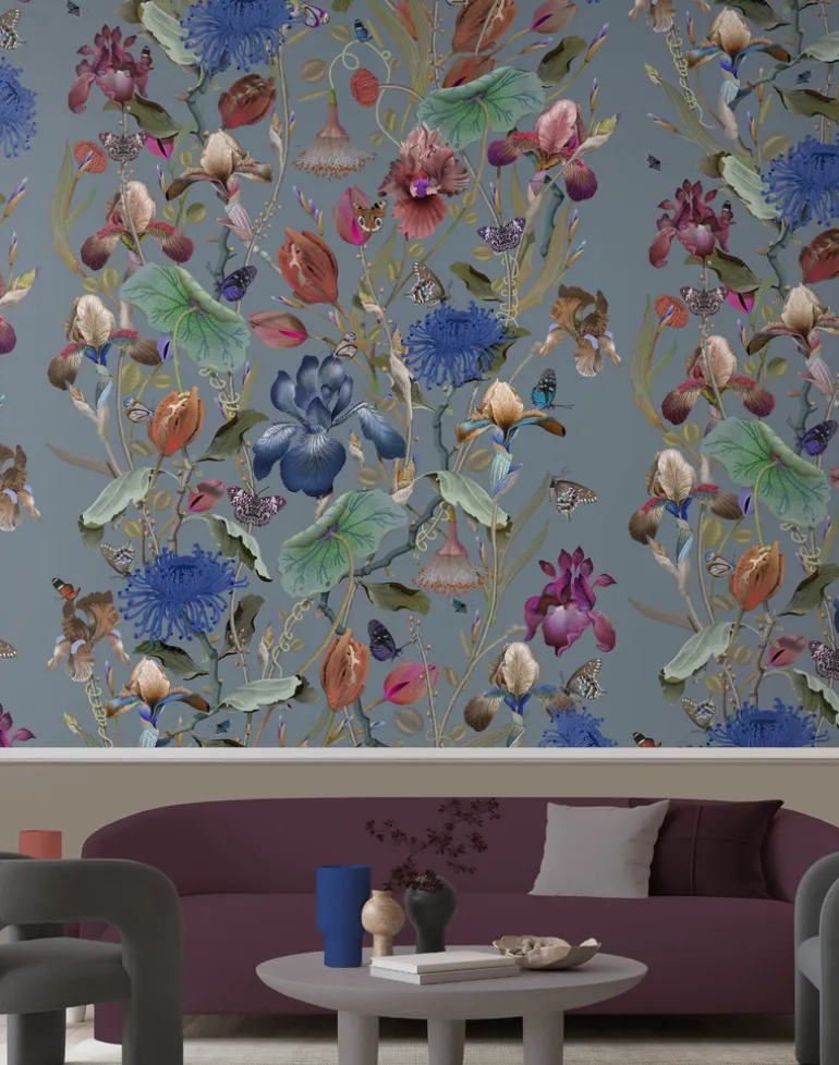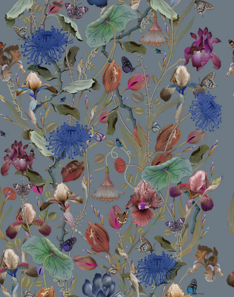 Royal Iris unfurls in a magnificent profusion, glimmering as if one has discovered an untouched plateau composed entirely from the rarest and most precious flowers. Butterflies and rare flora create an almost otherworldly scene. The rich palette of golden ochres, inky blues, and verdant greens imbue this curious realm with depth, luminosity, and opulence. The intricacy and control of the draughtsmanship is given full expression in this magnificent scale, speaking to the distinctive design vocabulary of the studio. The super-wide design has no horizontal repeat which intensifies the dramatic impact of the design whilst also significantly reducing waste.