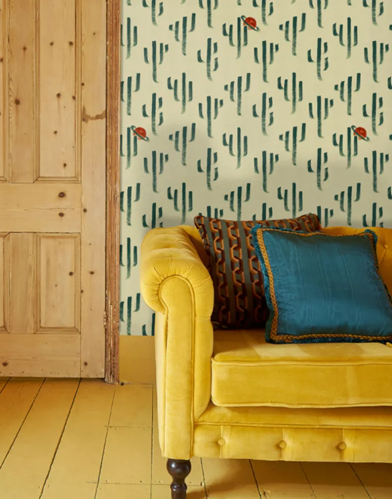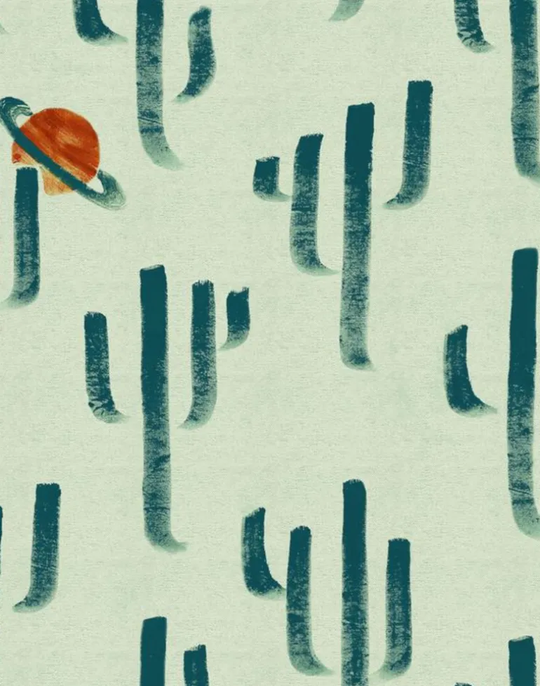 This bold, abstract print makes a strong and stunning statement and reminds us of sleeping under the stars. We’ve captured the familiar silhouette of giant desert saguaro’s which stand tall and strong. They are circled by the planet Saturn, to capture the feeling of mystery and magic of a desert ranch.
