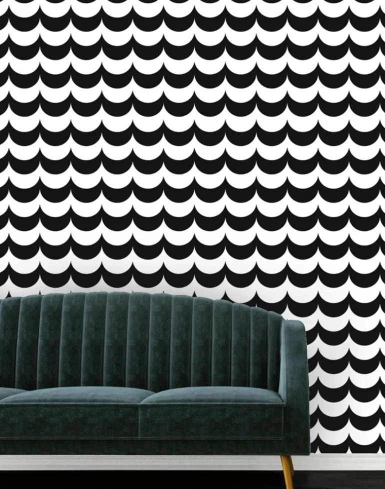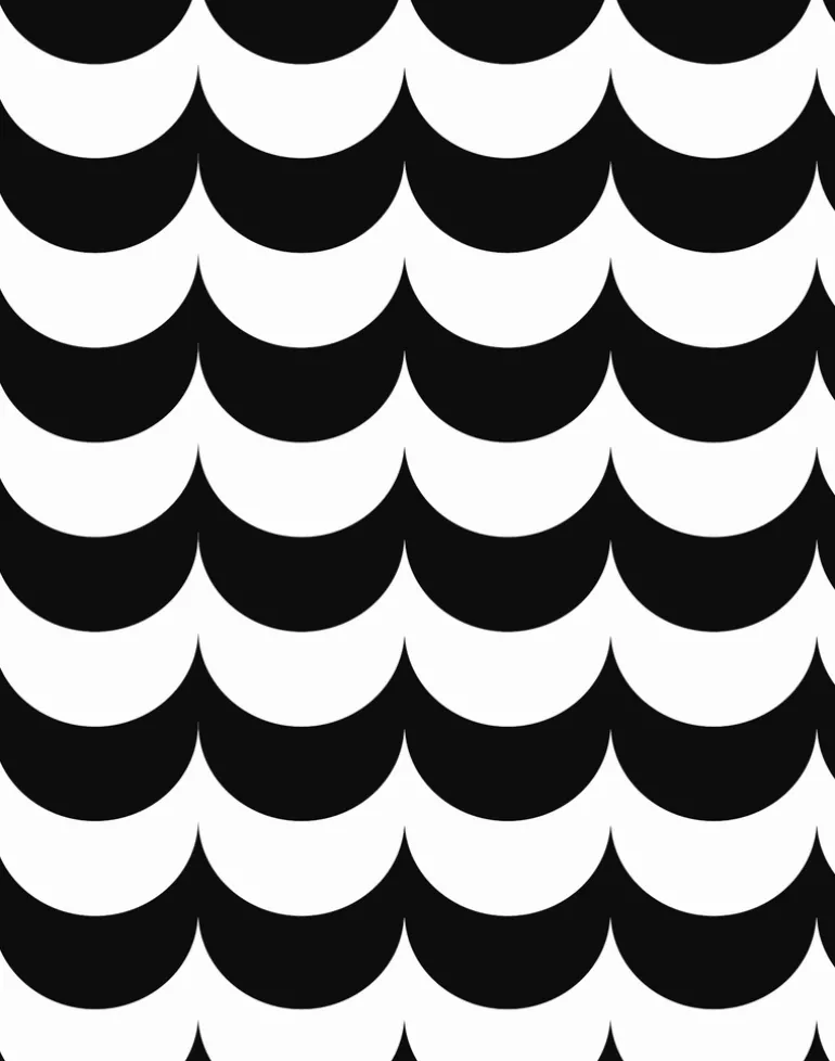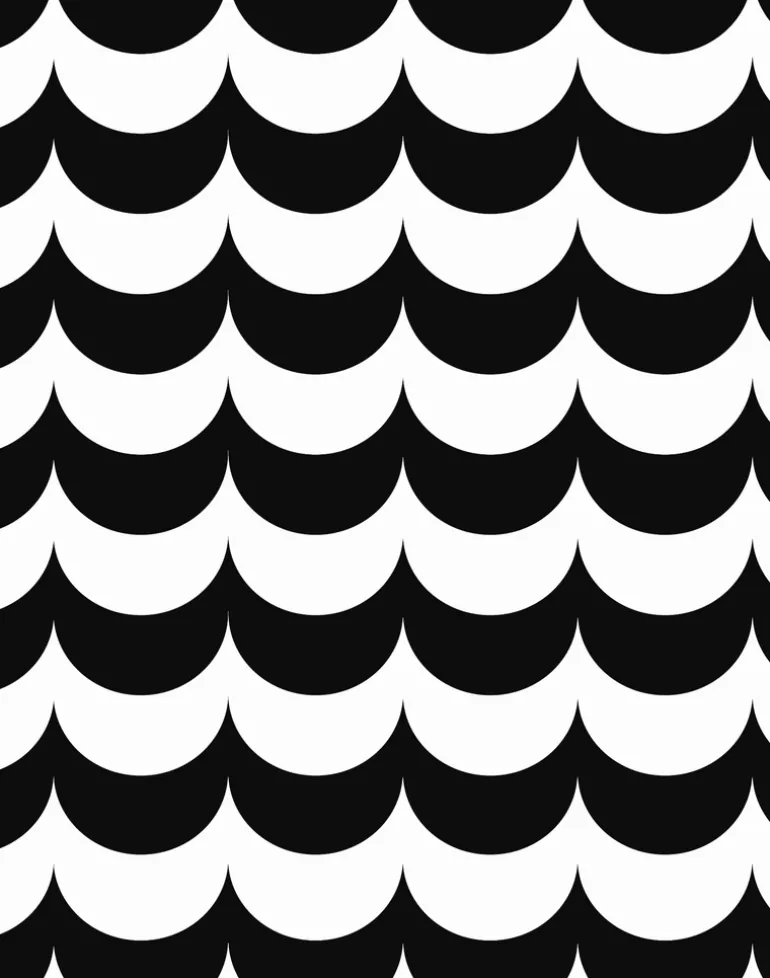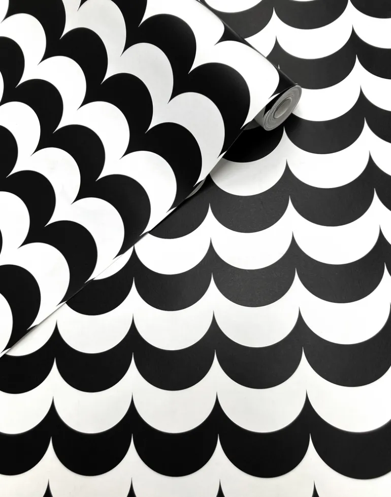 A graphic black and white wallpaper pattern on a smooth, white non-woven ground (a flat print wallpaper)