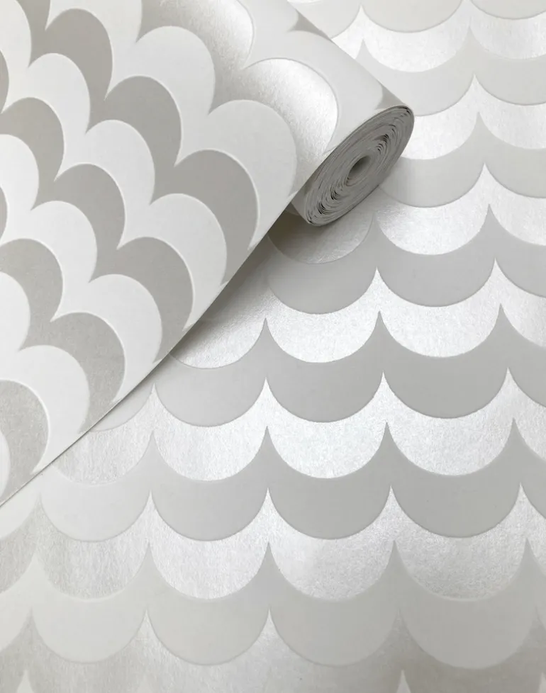 A white flock wallpaper pattern on a heavy weight lustrous silver ground