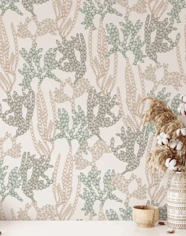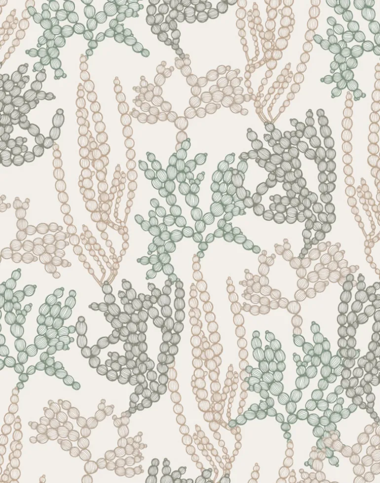 Inspired by Neptune’s necklace or sea grapes, these Australian native algae have such a beautiful definite shape with their spherical beads along tapering strings moving gently with the flow of the wave as it washes up on the shore. Sea Beads design from Patricia Braune’s Coastal Lines Collection.
