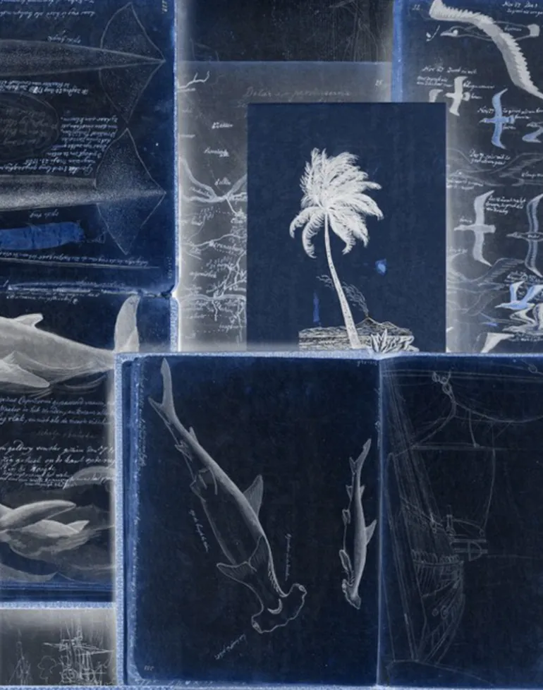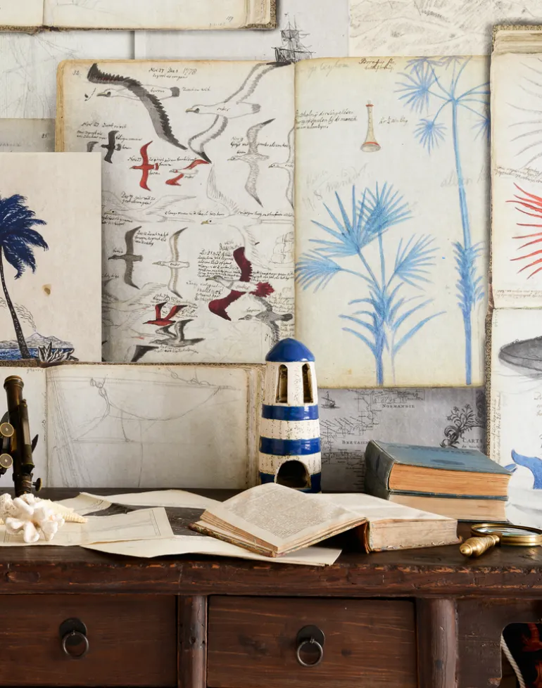 Depicting seaside memories on board of an old yacht, the SEAMAN’s JOURNAL wallpaper lays out marine details of the abundant underwater life, as well as specific birds and plants found in the area. Available in a soft sand shade or indigo background, the fine details give a tridimensional appearance to the entire design.