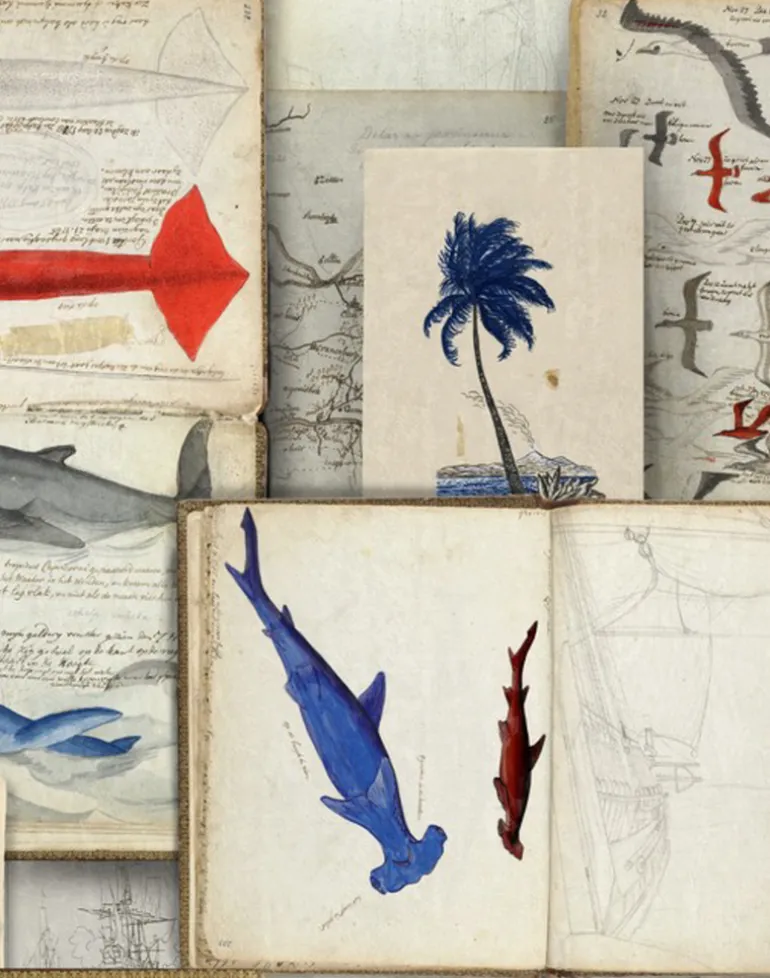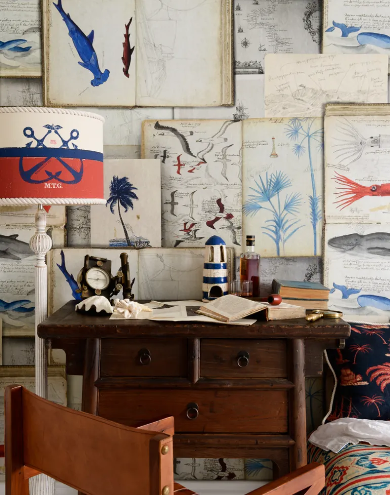 Depicting seaside memories on board of an old yacht, the SEAMAN’s JOURNAL wallpaper lays out marine details of the abundant underwater life, as well as specific birds and plants found in the area. Available in a soft sand shade or indigo background, the fine details give a tridimensional appearance to the entire design.